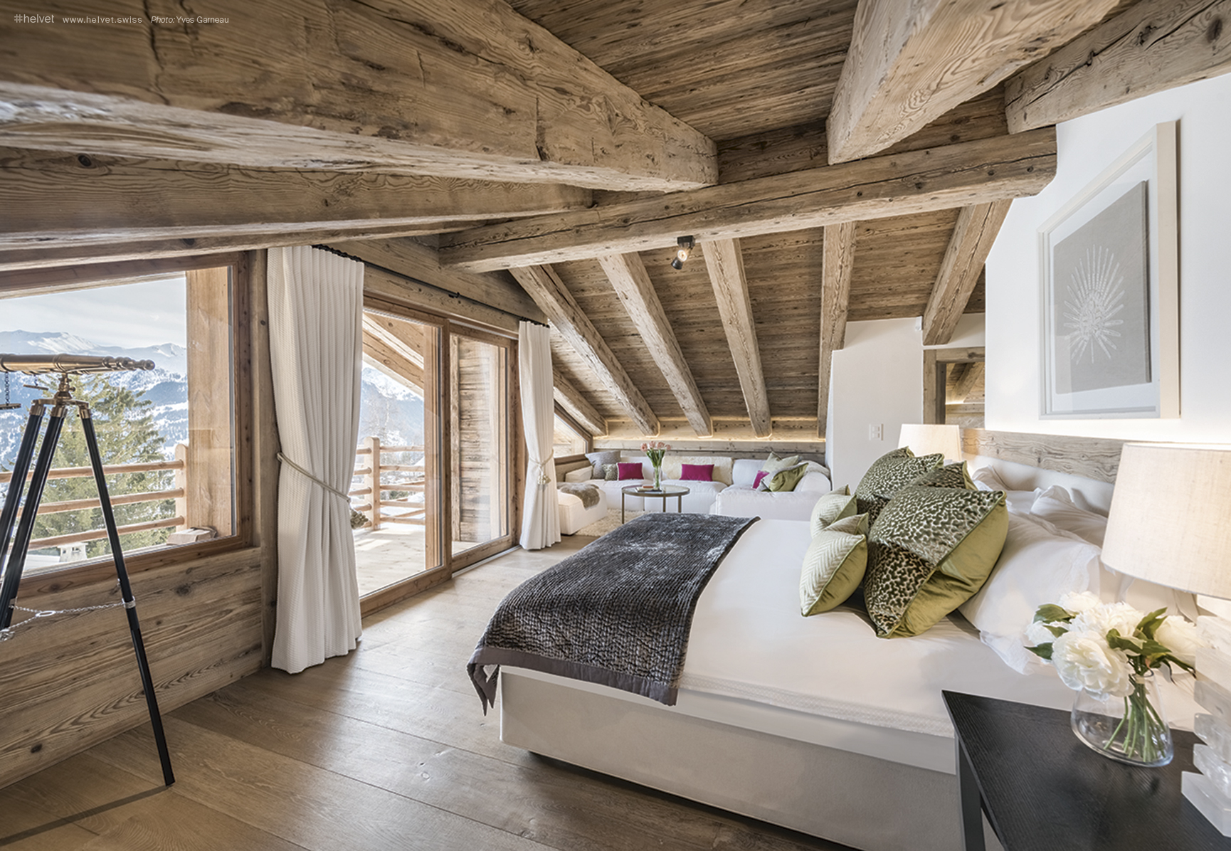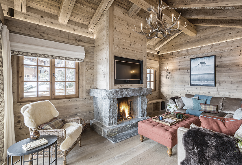 Given its appearance, it is hard to believe that the Chalet Bioley has just been built. The imposing master beams, fine stone fireplace, and the deer-head chandelier all speak of tradition. The furniture also blends in seamlessly with the décor. There are no avant-garde follies here; just wicker armchairs, sofas the colour of dry earth (but very comfortable all the same), and cushions that make no attempt to be noticed. This is living done the simple way.