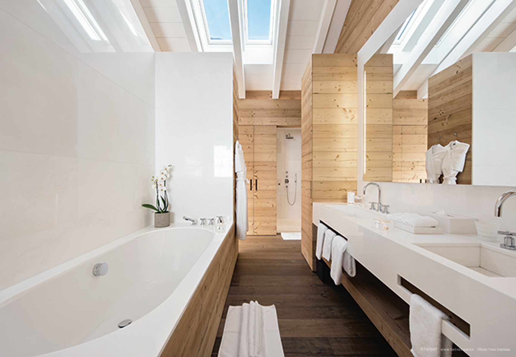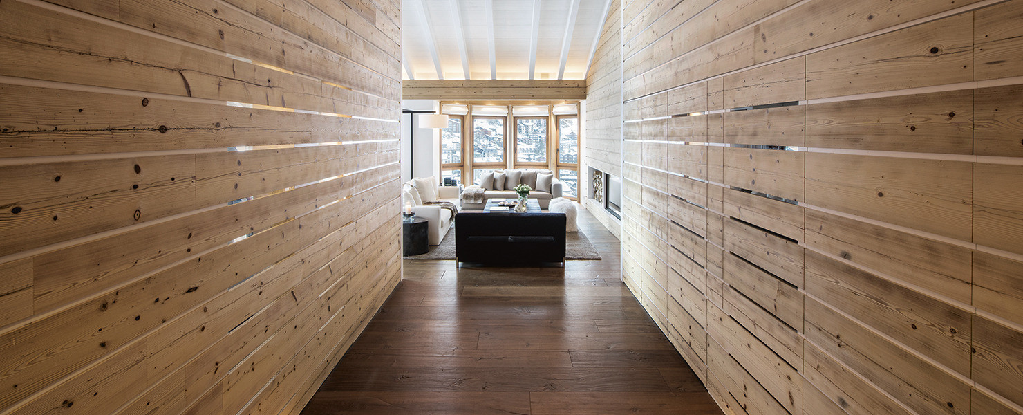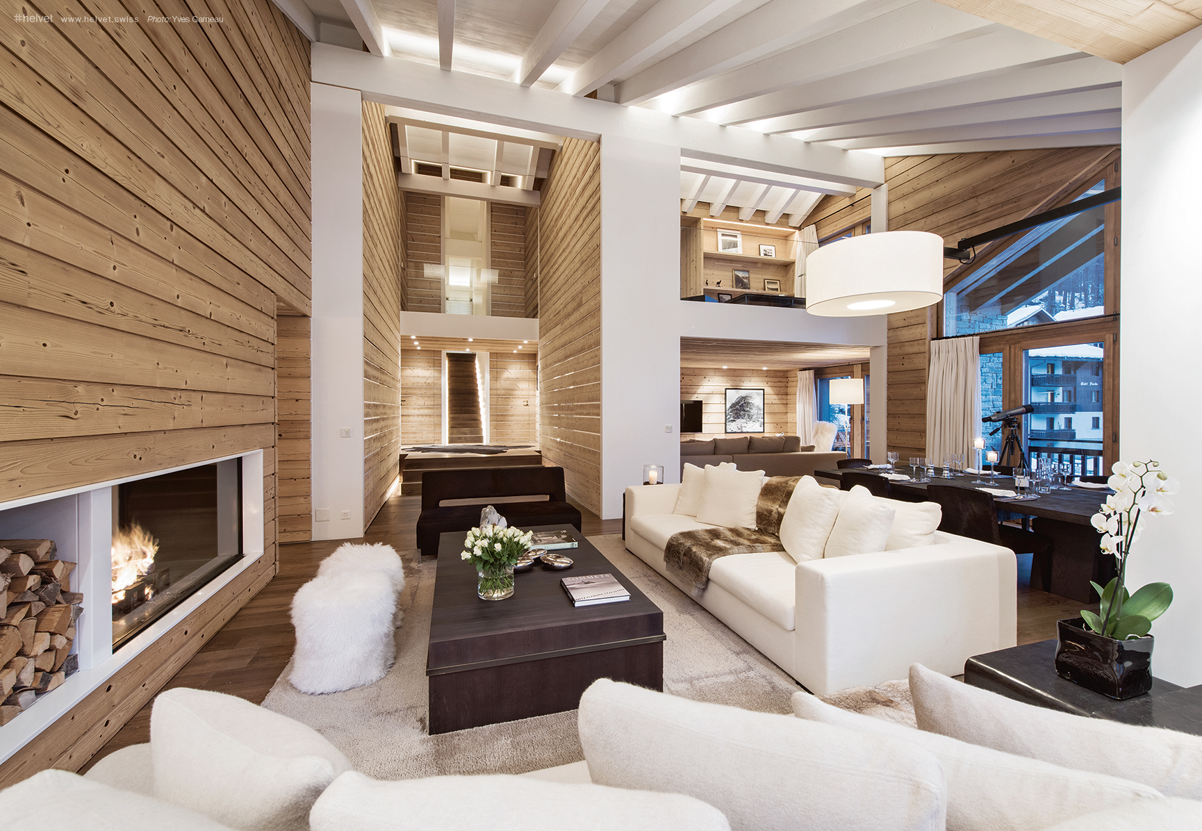 This 437 m2 space is one of Zermatt’s most exclusive. It’s the plush and perfect union of mountain tradition and contemporary comfort. The apartment’s floors and accent walls of elegant, upcycled wood contrast beautifully with the modernity of the ceiling’s exposed, white beams. The living room’s proud fireplace is double-sided, allowing those in the kitchen (where a second dining area is located) to also fully enjoy its crackling heat. Tucked into a corner of the main dining area is a charming TV nook, located below two of the bedrooms and furnished with the very latest in audiovisual technology.