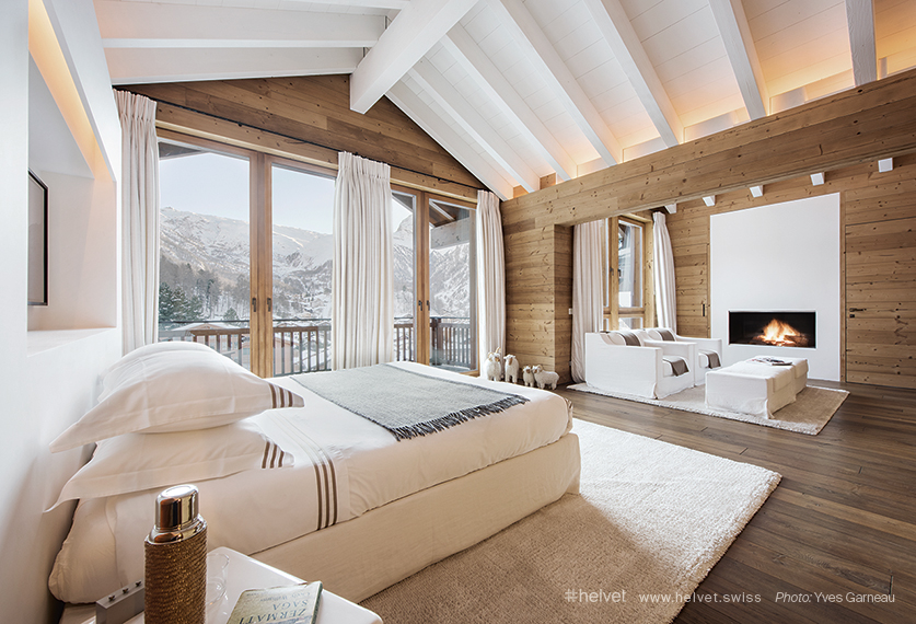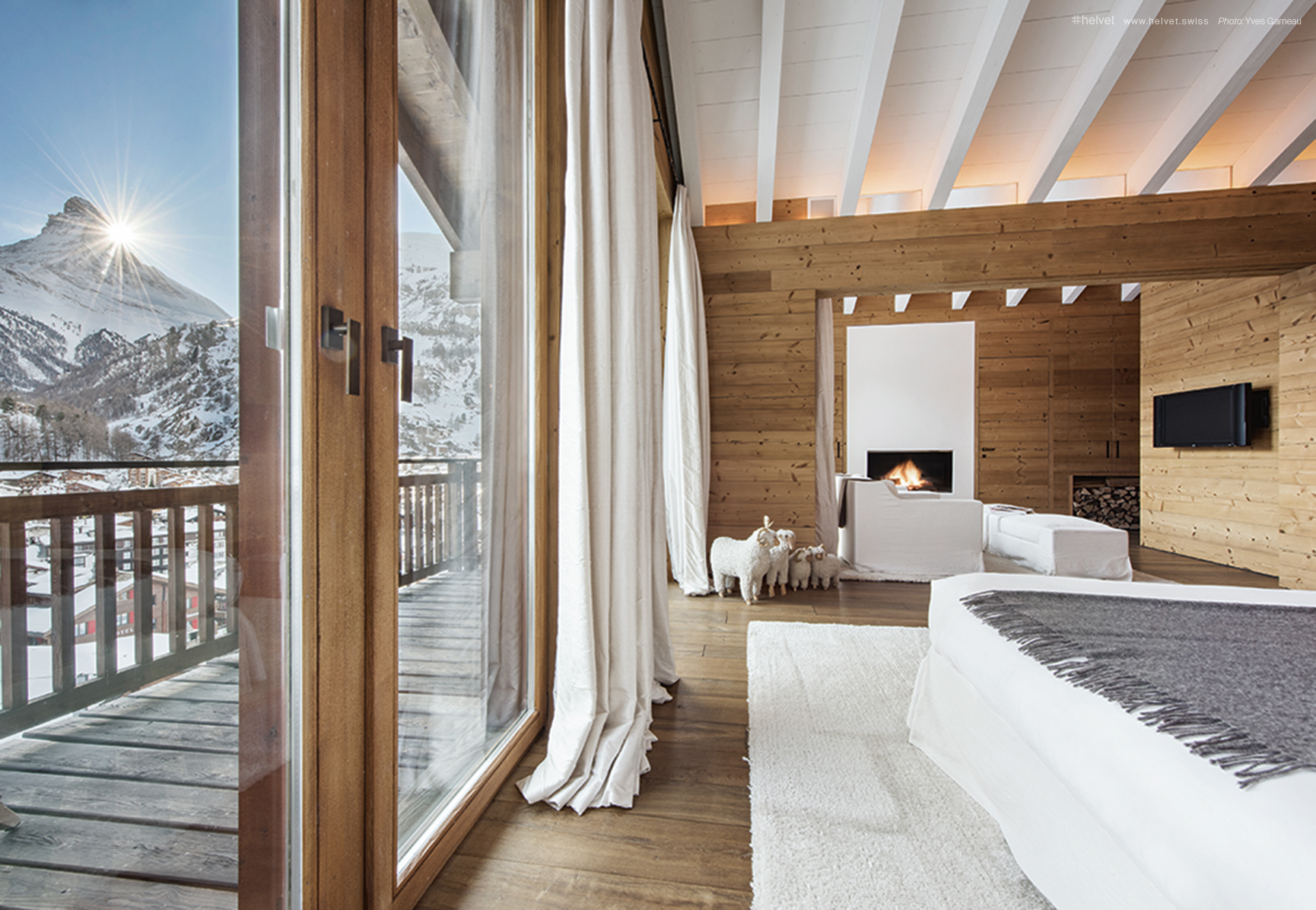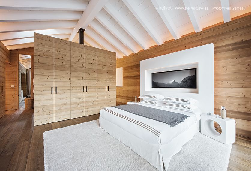 A spectacular stairway leads to the inviting second floor, which is dominated by the large master bedroom, its fireplace, ensuite bathroom, and balcony overlooking the Matterhorn. The two additional bedrooms, which share a bathroom, are further complimented by an open office space directly above the TV nook. All rooms boast closets and cupboards that are flush with the walls, giving the entire apartment a sleek, minimal feel that’s practical without disrupting the ethereal harmony intended by its architects.