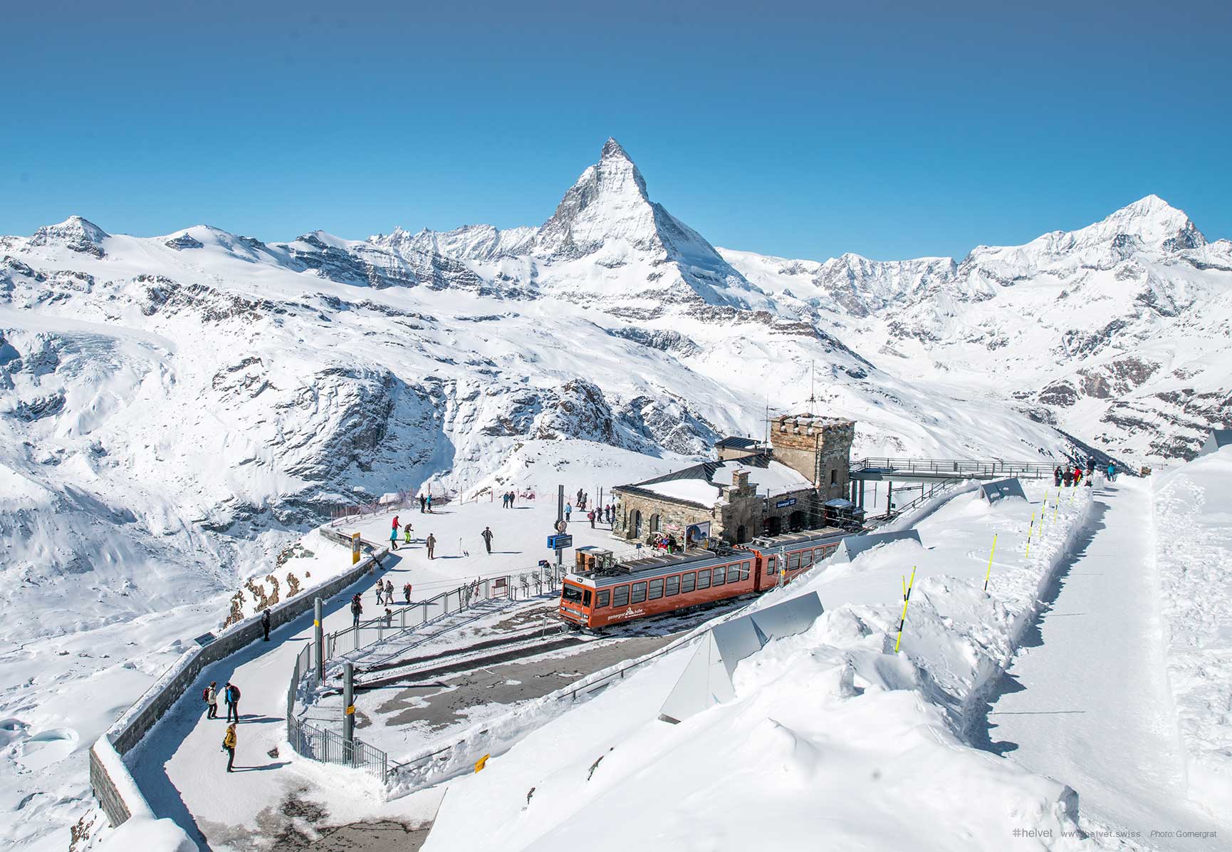 The Gornergrat Bahn is a record-breaking railway that takes its passengers to new heights. Opened in 1898, it is Switzerland’s first electric cog railway and is also the highest openair railway in Europe. Setting off from Zermatt Station, it climbs up to the Gornergrat (3,089m), where the country’s highest hotel stands. The delightful 33-minute journey takes in breathtaking scenery and no fewer than 29 four-thousanders, with the Matterhorn taking pride of place among them.