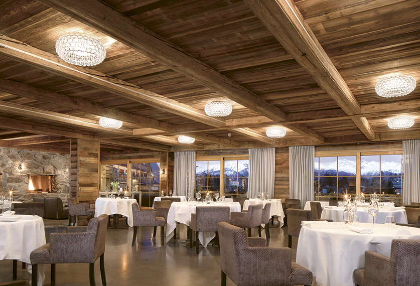 On the upper level, the large bay windows of the gastronomic L’Ours offer the same stunning views of the snowy Alpine landscape beneath a sky of twinkling stars. The establishment’s headliner restaurant welcomes you in a harmonious ambience of warm wood, stone and fire… but dining here is anything but ordinary. The kitchen is run by celebrity Chef Franck Reynaud, Gault&Millau’s Chef of the Year 2018 and a 2023 Swiss Culinary Merit award winner. Boasting 18 points with Gault&Millau (since 2018) and one Michelin Star, the restaurant proudly reigns over the Valais gastronomic scene.
