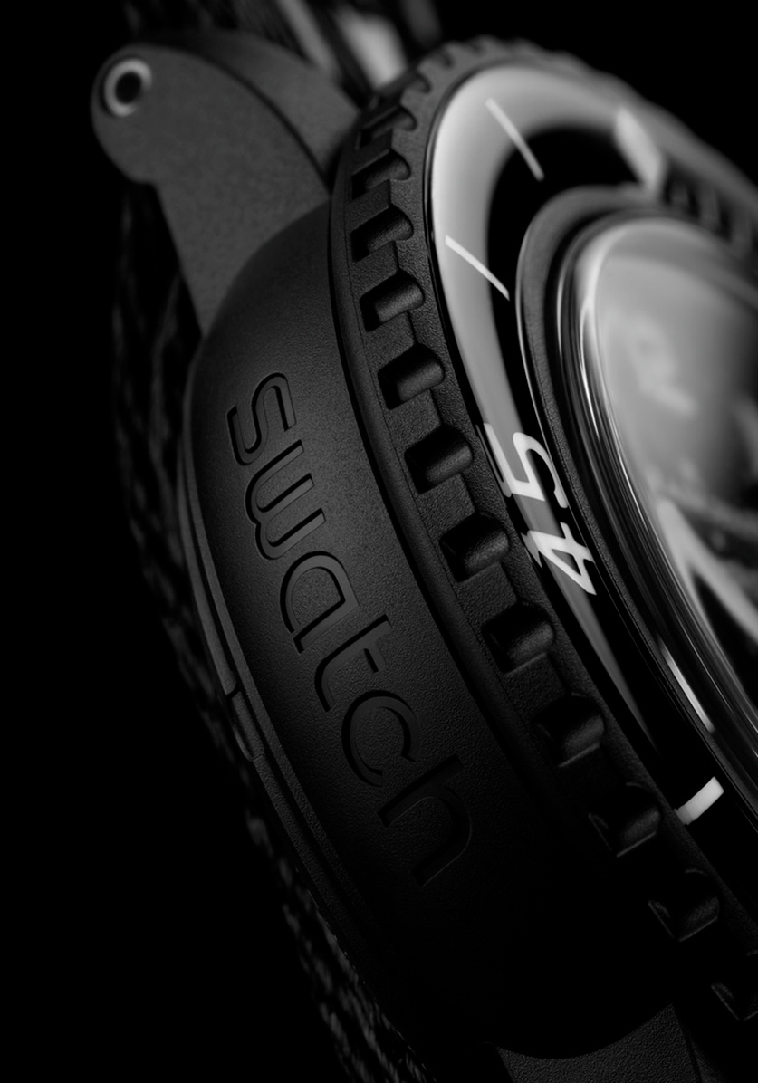 A non-limited model, OCEAN OF STORMS, comes in a black color inspired by the new moon (also known as the Black Moon). Just like the other five Bioceramic Scuba Fifty Fathoms, OCEAN OF STORMS has a Swatch mechanical movement, SISTEM51, the first and only mechanical movement whose production is entirely automated. This mechanism, made up of just 51 parts - including one central screw, is anti-magnetic, thanks to its Nivachron™ hairspring and has a 90-hour power reserve. In 2013, SISTEM51 revolutionized the world of automatic watches with its visible movement: the front tells the time, the back tells the story. OCEAN OF STORMS has been given its own nudibranch (scientific name: Nudibranchia), Okenia Luna. It is featured in a digital print on the movement’s rotor, the part that allows the watch to recharge automatically with a simple movement of the wrist. The full moon zoomed in on the Ocean of Storms is also digitally imprinted on the oscillating weight.