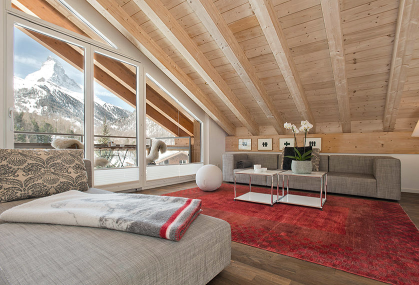 Built for the owners of the famous high-altitude restaurant Zum See, this chalet near the town center contains four high-end apartments. Each apartment takes up an entire floor and they are all contemporary in design with clean lines and an abundance of natural light. The ground floor apartment boasts a large terrace with a garden and views of the Matterhorn, while the upper floors each have exceptional balcony views, and the top floor penthouse enjoys a cathedral living room. All apartments have access to a heated ski room and a wellness space (with a sauna and steam room), along with croissants and bread that are delivered fresh every morning.