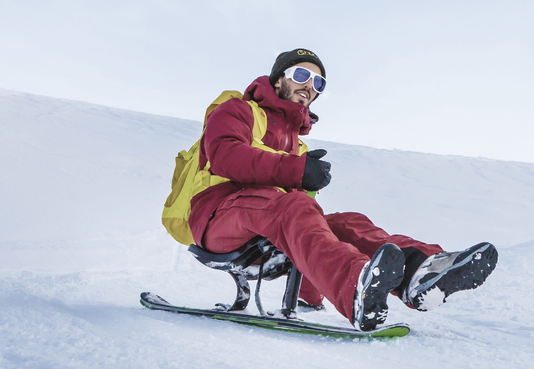 Rotenboden Station, 2,815 m. You may have barely stepped off the small red Gornergrat railway, and the regulars have already mounted their sleds for one of the most beautiful descents in the Alps. Their destination? Riffelberg station (2,582 m), just 1.5 km away. Beginning December 19, 2019, a new option will be available for winter sport enthusiasts: Snooc. What’s Snooc? It’s a sled made of a seat that’s built onto a single ski, with a handle for grip. Lightweight, comfortable, and easy to manoeuvre, Snoocs allow riders to turn or even carve simply by lowering one arm to the side. Snoocs can be rented along with classic sleds at Rotenboden.