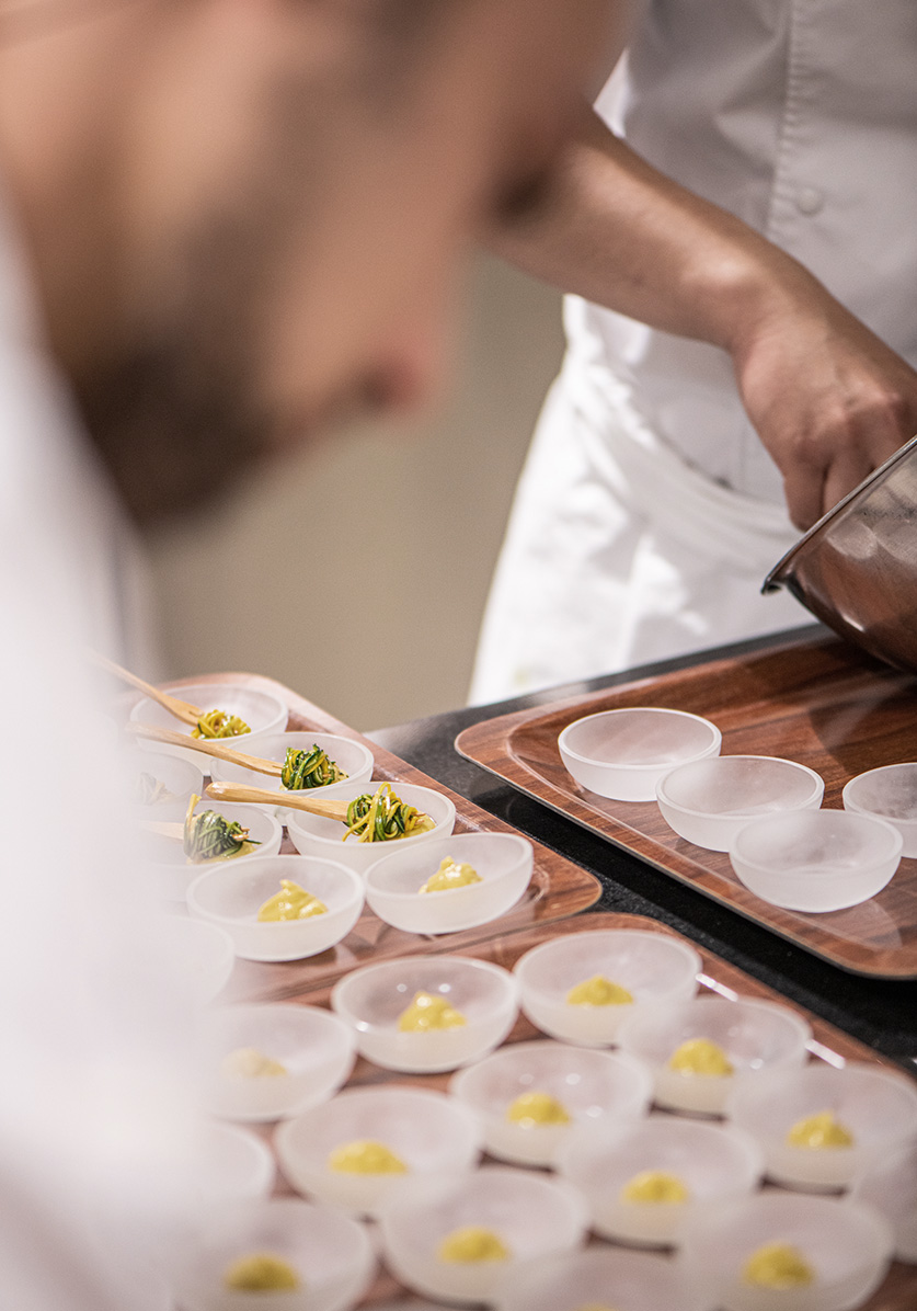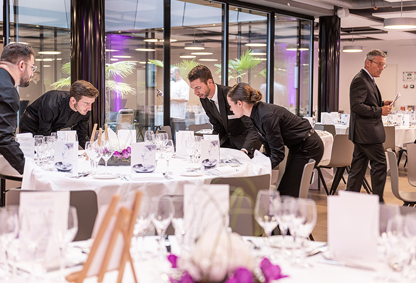 Les jours précédents la soirée ont été consacrés à des ateliers avec les MOF, des préparations avec les chefs, des répétitions de service en salle, la mise en place de superbes décorations florales sur des tables de gala, la décoration de la salle, la coordination de la soirée… une véritable pièce de théâtre !