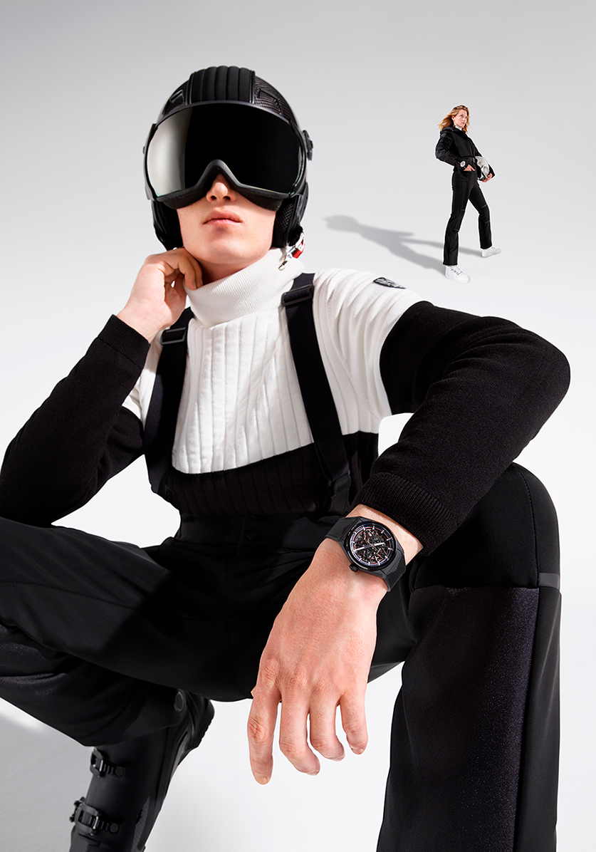 Crafted using a durable yet supremely comfortable softshell by Swiss fabric-maker Schoeller, the outfits are soft and stretchy without any of the bulkiness associated with traditional ski clothing – while remaining warm and breathable for a day on the ski slopes. In a timeless palette of black and white, the quilting design takes on an exclusively designed graphic linear motif, also found on the straps of the watches. The outfits are adorned with a specially developed logo for this capsule, consisting of a superimposed star and snowflake that also make up the watches’ open dial motif.