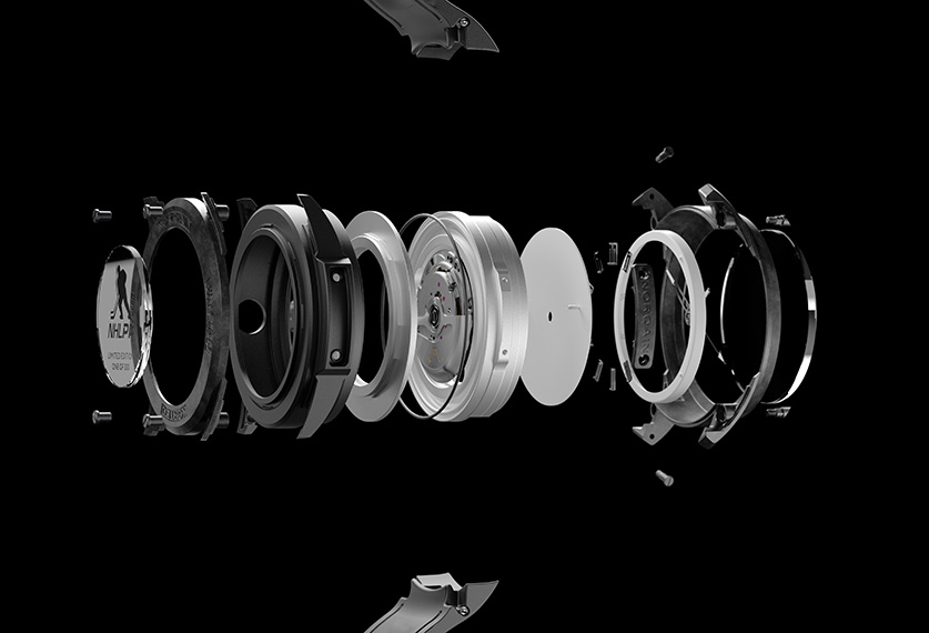 What immediately stands out about this 100% Swiss-made Wild ONE timepiece, aside from its incredible lightness, is its innovative construction. The case has separate top and bottom NORTEQ parts, developed by strategic partner BIWI, which serve as a protective cage and are connected and secured with custom-made screws. Between these parts is a black rubber shock absorber that surrounds a titanium container in which ticks the NN20/1 Manufacture Calibre. The shock-absorbing BIWI rubber bumper of each watch has been mixed with the material of an ice hockey puck, giving every model a unique appearance. Water resistance to a depth of 200 metres expands the range of sports that the Wild ONE is suited for. In total, the case is made of 25 parts, including four screws which are engraved with a mountain-peak design. This watch weights just 84 grams, which is 50% lighter than a stainless steel NORQAIN watch.