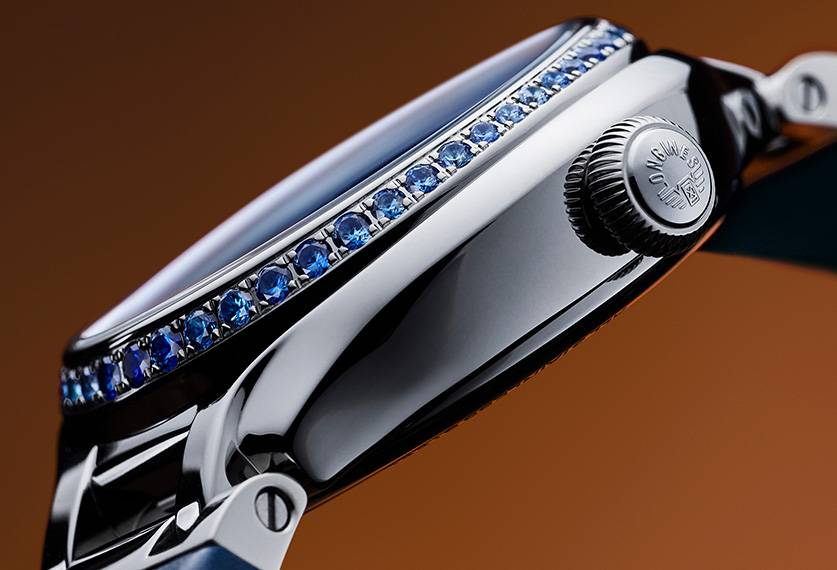 The extraordinary blue-dialled PrimaLuna represents the collection’s pinnacle of horological artistry. It marks the first time in PrimaLuna history that the bezel is adorned with carefully selected sapphires. Forty-eight gemstones totalling 1.06 carats across four distinct hues and sizes create a subtle gradation that mirrors the infinite variations of the twilight sky. Paired with a unique celestial blue mother-of-pearl dial embellished with 14 diamond indexes, this timepiece transforms the traditional moonphase complicationinto a celestial celebration of colour, light, and Swiss horological mastery.