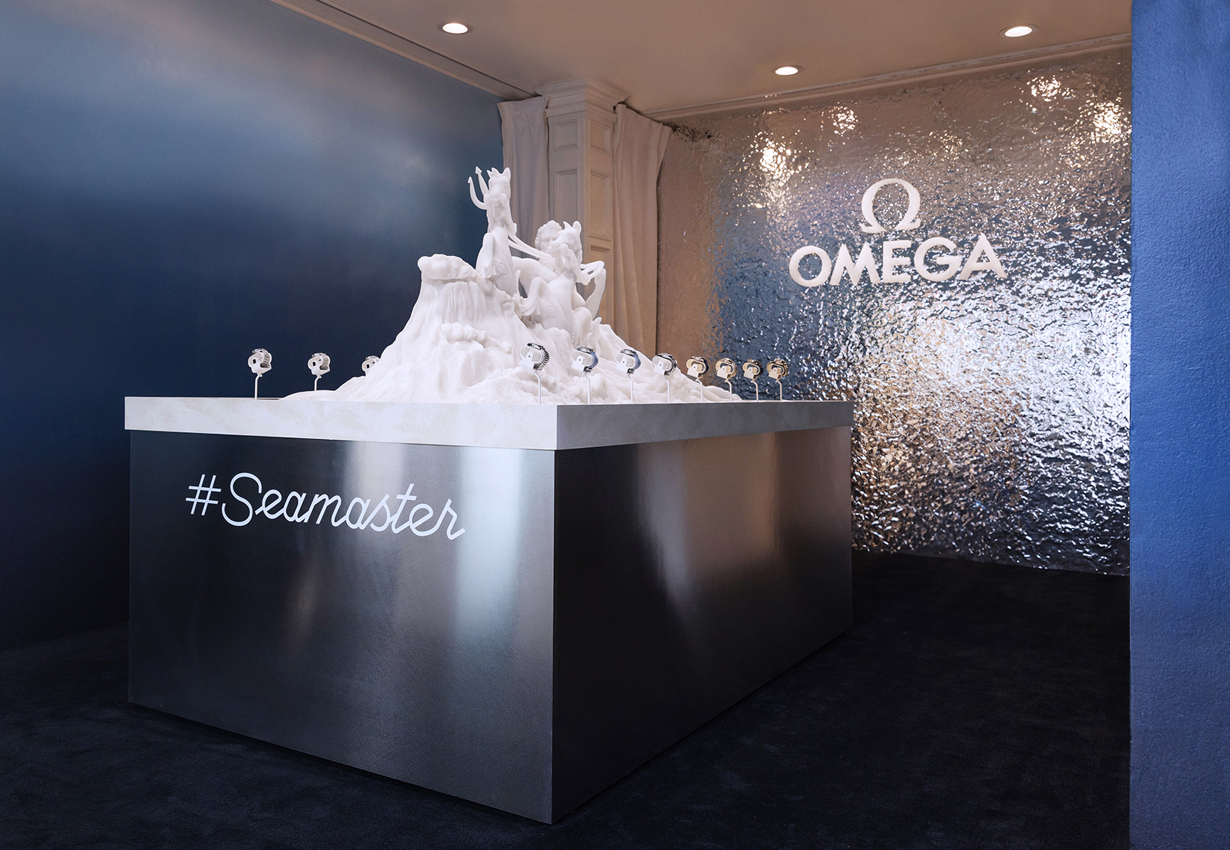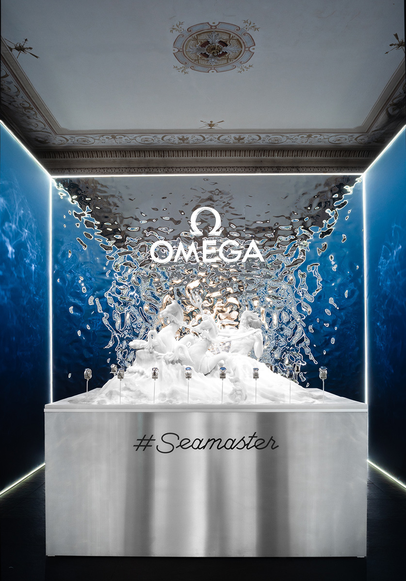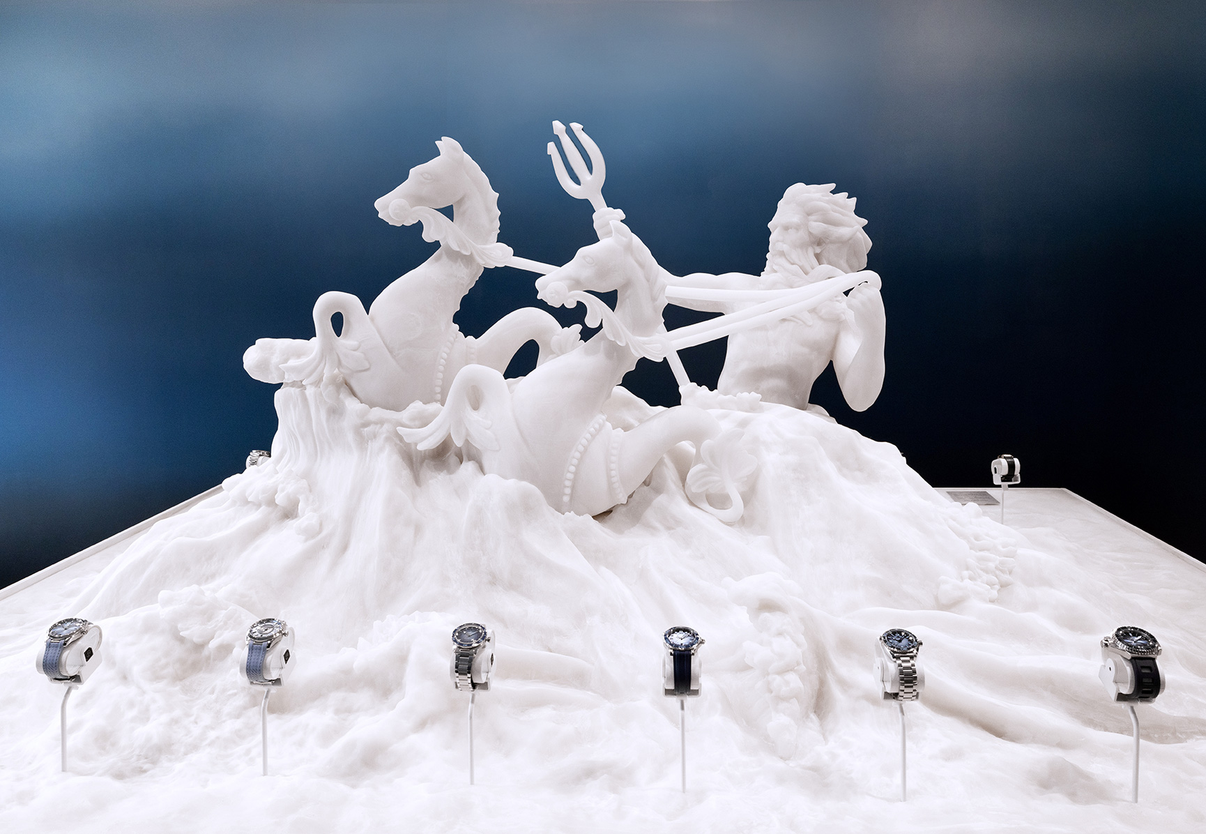 Surrounding the statue is a selection of vintage Seamaster timepieces, including some of the most important diving designs, as well as eight new models from the Seamaster in Summer Blue collection. These watches are OMEGA’s highlight of the summer, introduced with a changing gradient of blue dials that reflect the Seamaster’s history of depth. The same gradient effect has been used in the interior design of the pop-up boutiques, while the Poseidon motif can also be found on the commemorative caseback of each new watch.