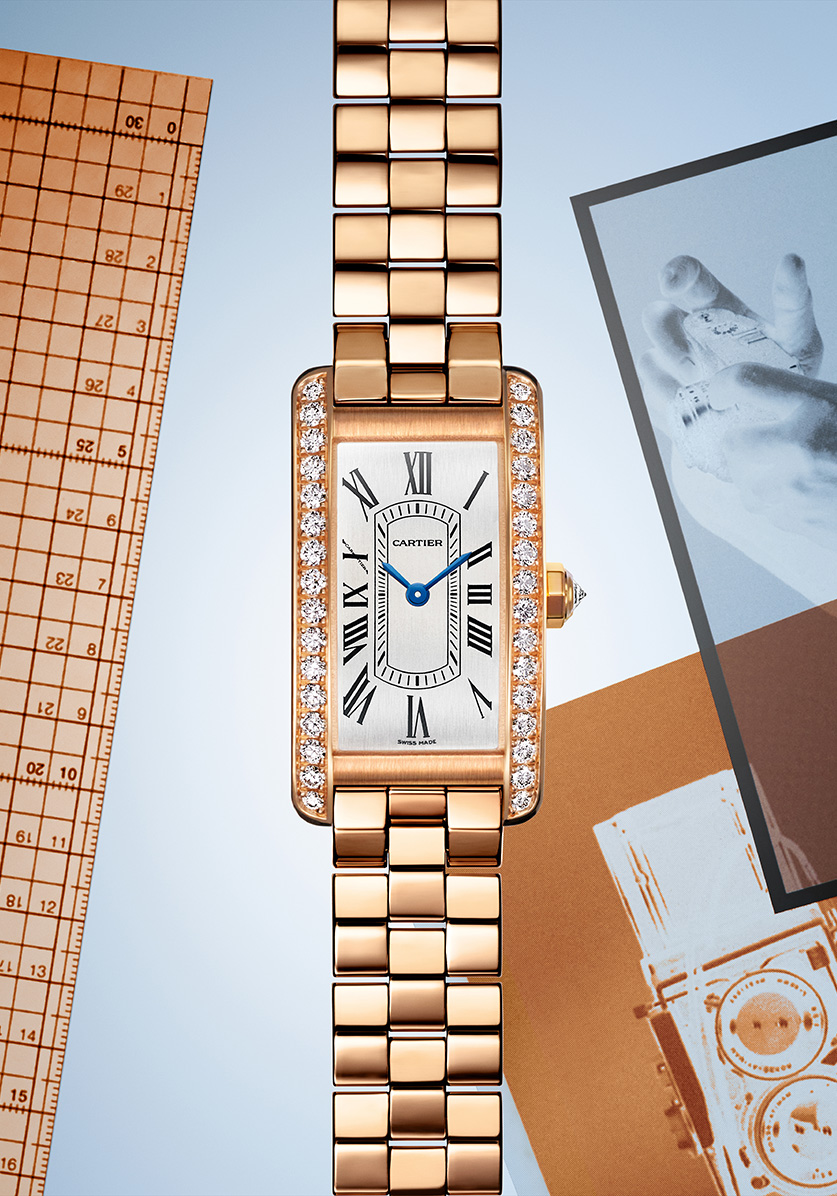 Equipped with the new Manufacture 1899 MC, a self-winding mechanical movement for slimmer cases, the Tank Américaine watch comes in all-gold and in steel with a leather strap or metal bracelet, rose gold and diamonds with a leather strap or diamond-paved white and rose gold with a metal bracelet. No matter the version, the watch celebrates the casual chic spirit of a continent on American time.