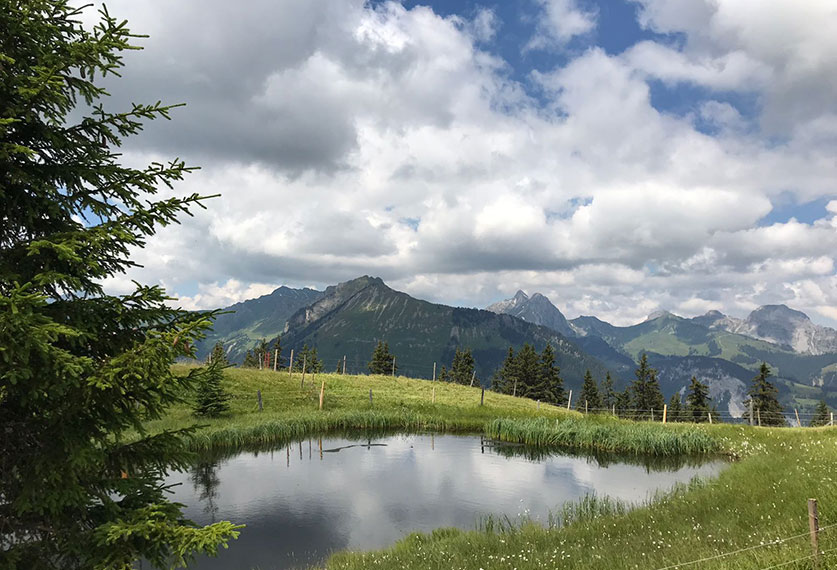 Arrimée au-dessus du village, cette grande dame en devenir — la pompe en moins — s’inscrit dans un paysage assurément digne d’éloges: dressant ses tourelles par-delà les rideaux de sapins préservant son intimité, l’Alpina contemple dument les alpages et les montagnes enneigées. Cette position dominante affirme l’ambition de la maison. L’armée de personnel, aussi discret que sympathique, les œuvres d’art contemporain et l’originalité théâtrale du hall d’accueil, avec son grand escalier en bois et son gigantesque tronc d’arbre-pupitre, contribuent tous, à leur échelle, à affirmer cette vocation au grandiose.