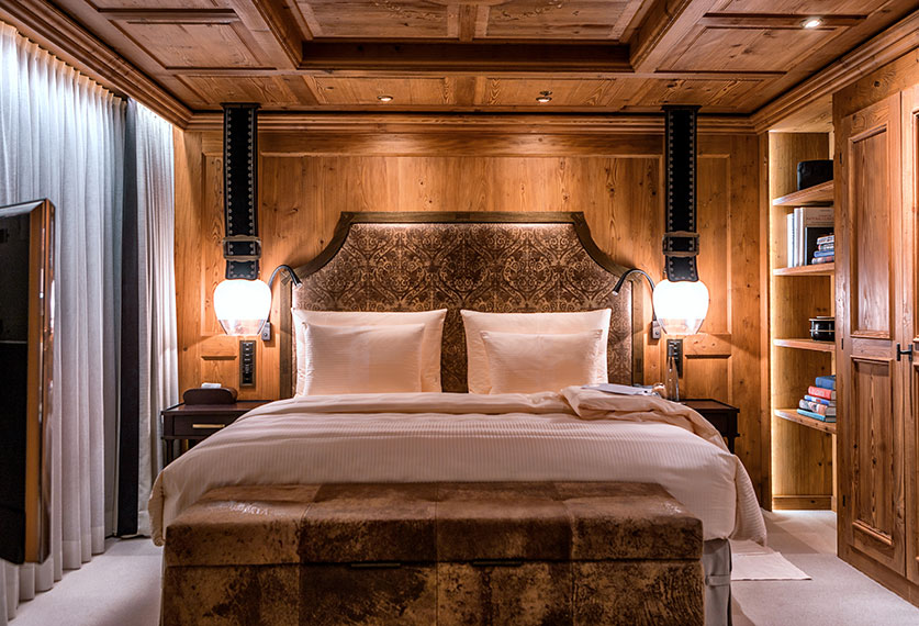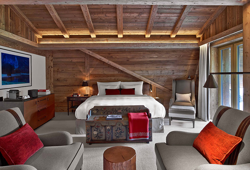 A l’antithèse du classicisme, les 56 chambres et suites, toutes avec balcon ou terrasse, évoquent les intérieurs de ces superchalets de grand luxe qui ont fleuri (notamment) à Verbier et Zermatt ces dernières années. On y retrouve la même patine du bois vieux de sapin et la noblesse des matières naturelles, gages d’ancrage dans l’identité alpine. L’esprit est au cocooning élégant, empruntant au vocabulaire suisse éternel, entre vénérables armoires paysannes transformées en bar, cheminées contemporaines (in-room pour les plus chanceux) et discrètes impertinences (telles ces suspensions-clarines).