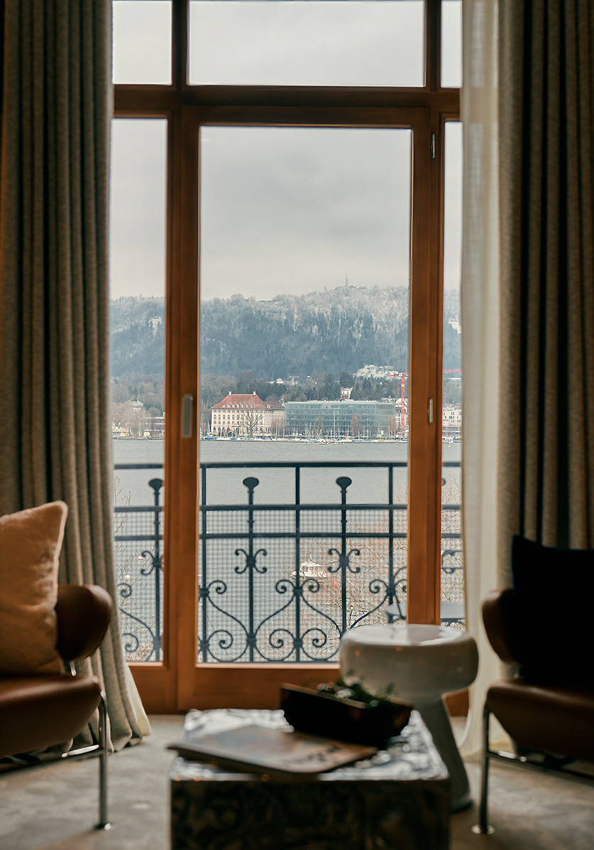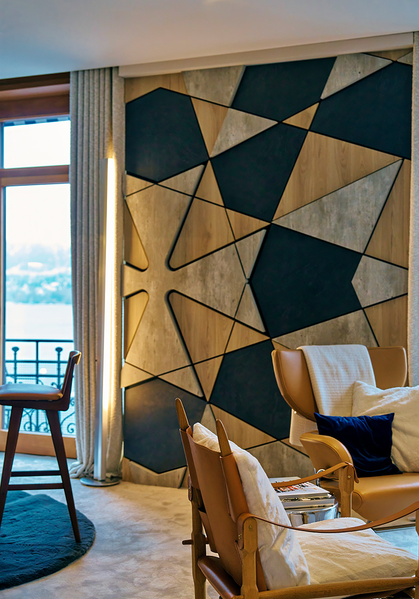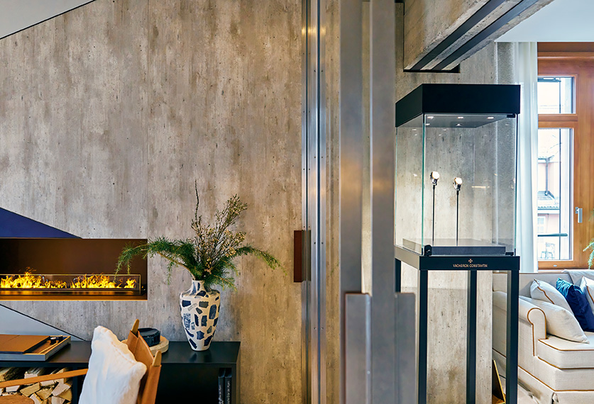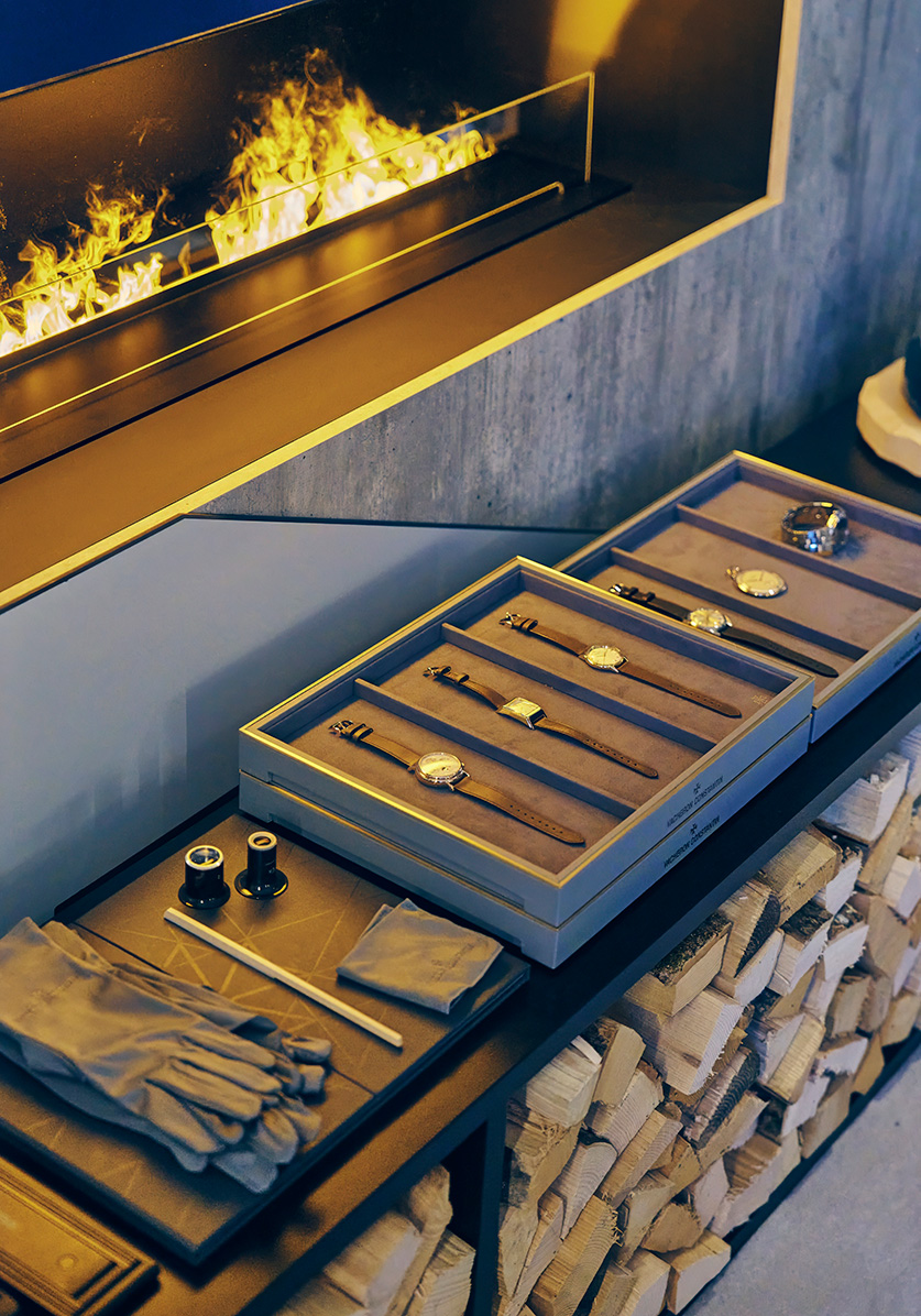The Suite 1755 at La Réserve Eden au Lac Hotel in Zurich, merges typical Swiss Alps spirit and contemporary style. The spirit of the space reflects the interiors found in luxury residences in the Swiss mountains. The furnishings are refined and warm, with stone displays and wood furnishings, and unbleached walls enlivened in places by mosaic decorations suggesting the Maltese cross emblematic of Vacheron Constantin. Here, a fireplace breaks with the lakeside horizon of the large picture windows overlooking the mountains. Here, the VIP lounge offers soft comfort for discovering the Maison's Haute Horlogerie collections.