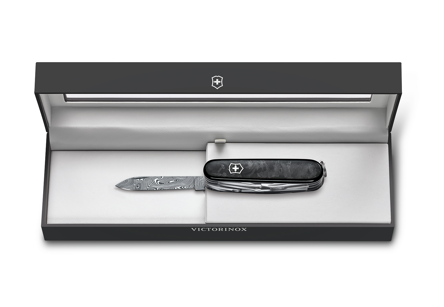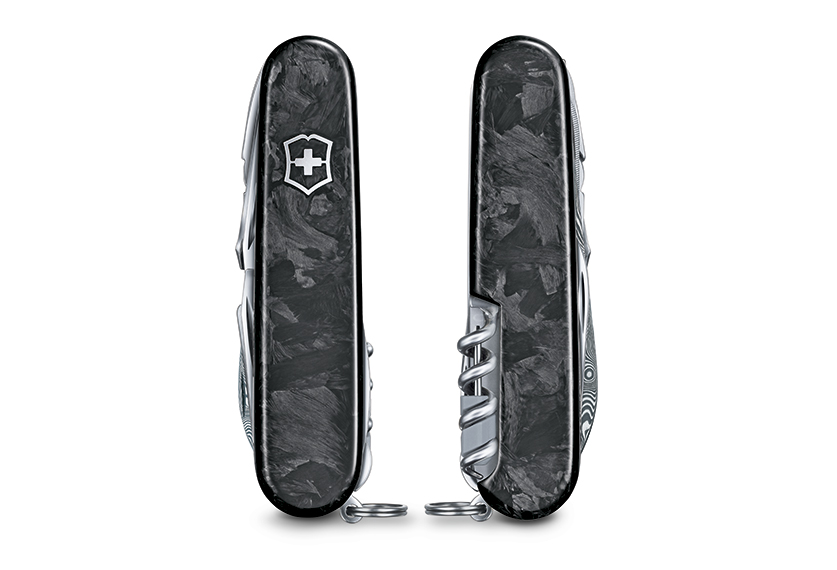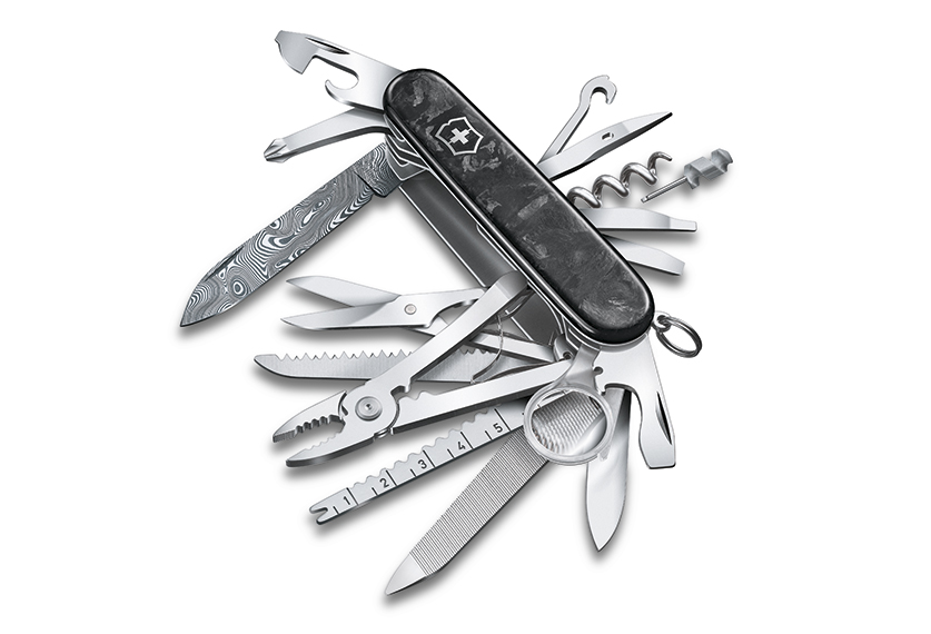 In terms of looks and expectations, it takes exclusive to a new level: damast steel blades and scales made from black forged carbon give this latest Victorinox pocket knife a truly innovative character. As a limited edition with only 6,000 sequentially numbered pieces available worldwide, the new Swiss Champs model has already achieved legendary status. In addition to the color and design, this knife is equipped with unique, exceptional characteristics: “Björkman’s Twist” is the name of this damast steel, forged with more than 100 layers to give it its unmistakable pattern, together with extreme durability. This is the high-quality steel Champions are made of, and the reason why Victorinox chose this material. And, a closer look inside the Swiss Champ Damast will reveal a grand total of 29 functions.