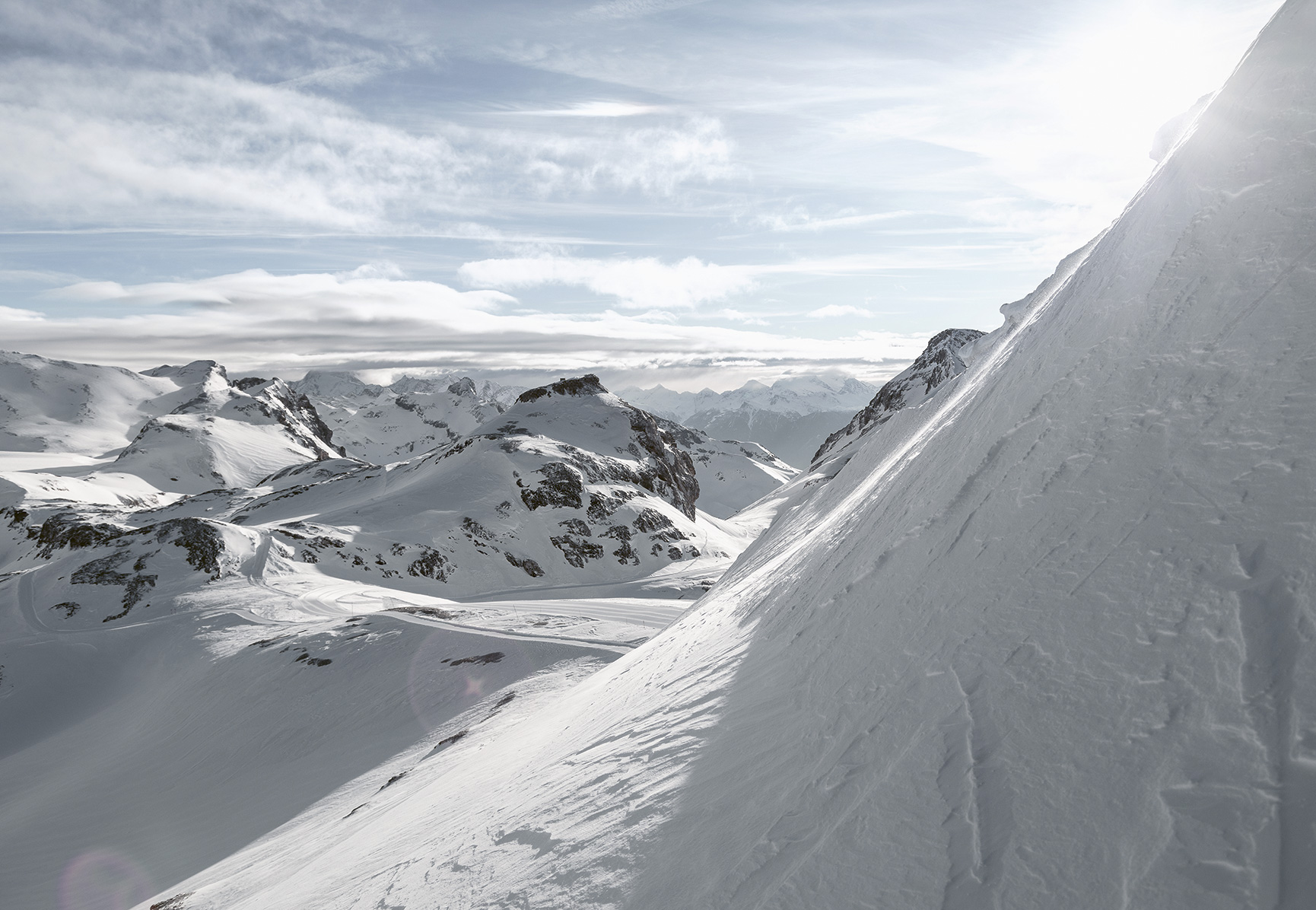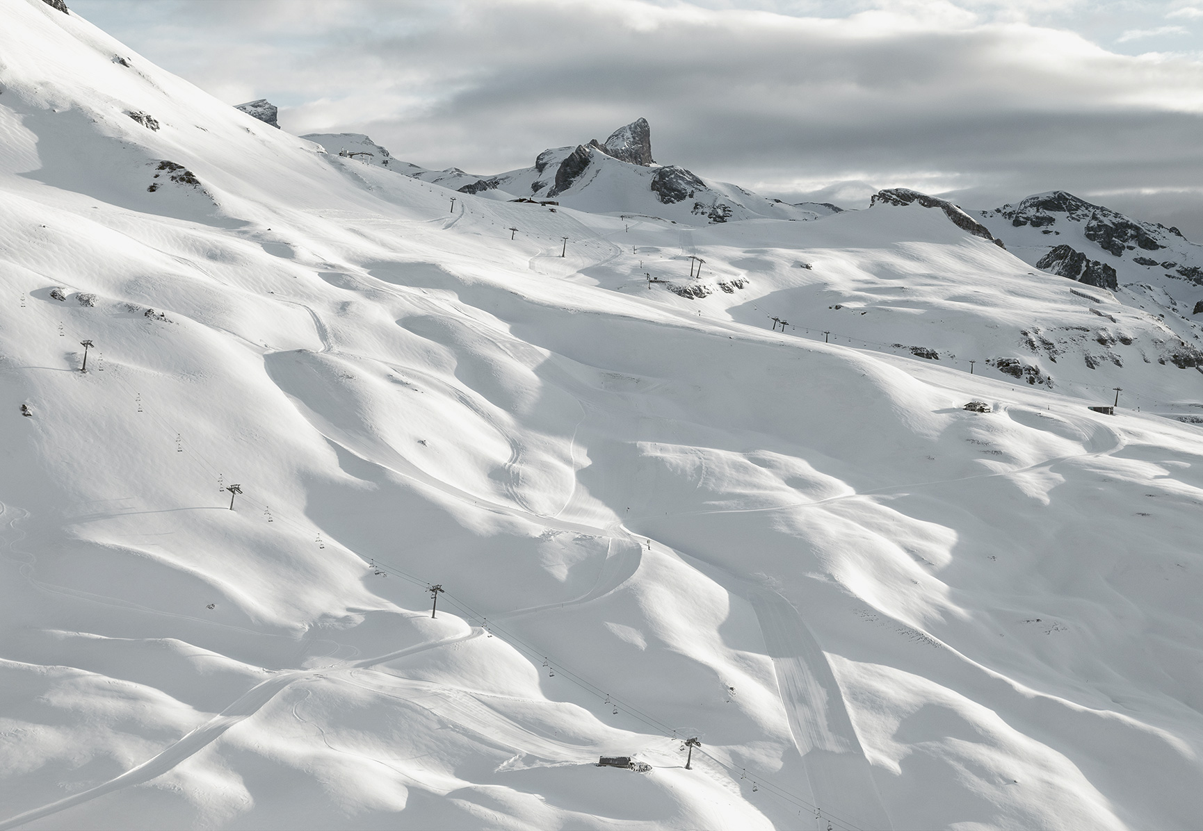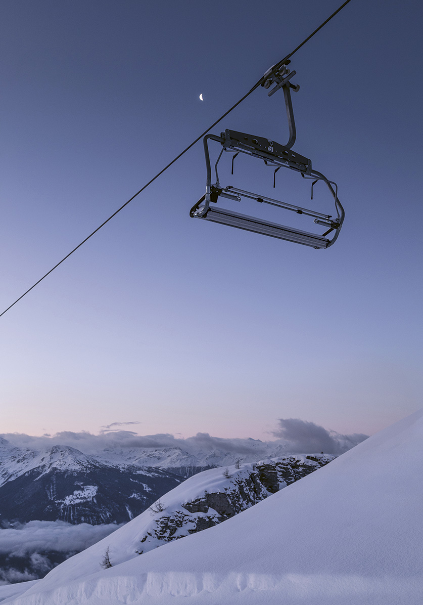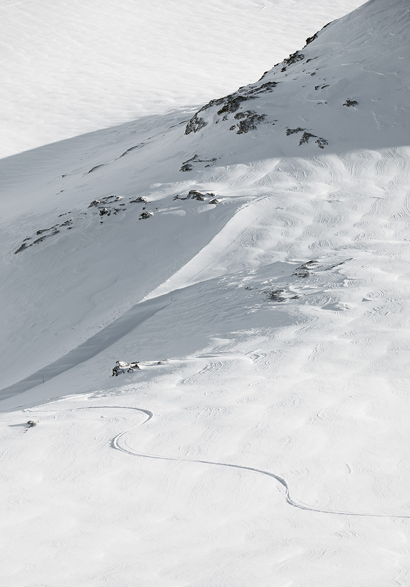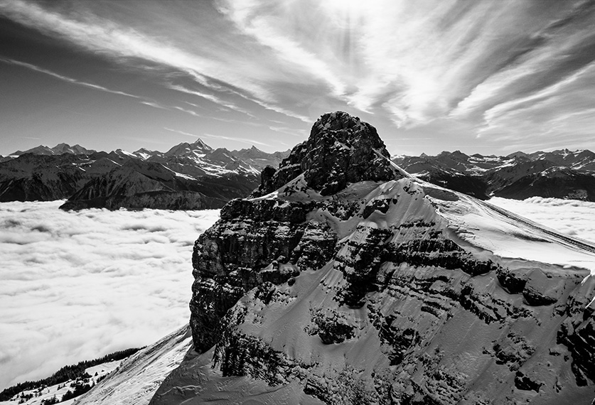 Et à Crans-Montana ? Les images de Tanguy Henrijean nous parlent d’une montagne forte là aussi en jeux d’ombres et de lumières, volontiers magnifiée par le drone et le « caractère intemporel » du noir-et-blanc. Une montagne pure et libre.