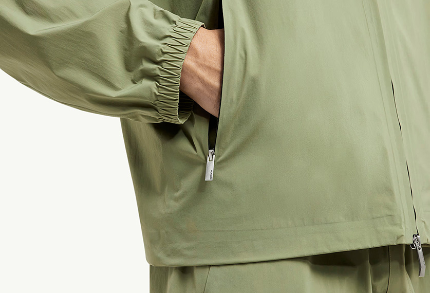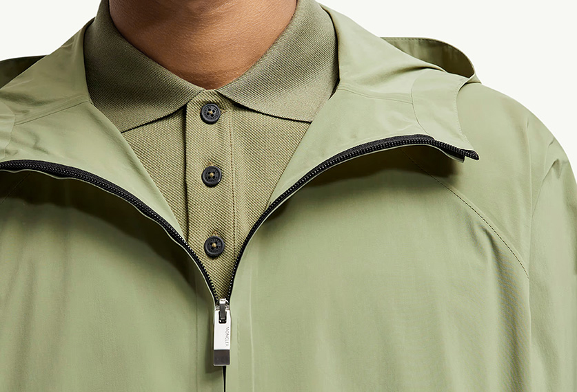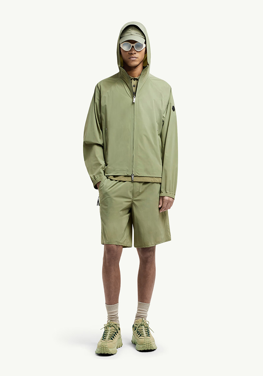 Zipped closures and concealed seams enhance the garment’s sleekness. Every element is designed to erase the superfluous and highlight the essential. The integrated hood, discreet and perfectly adjusted, completes the silhouette without weighing it down. Worn with matching pants or shorts, the jacket creates a tonal ensemble where sporty function meets quiet sophistication.