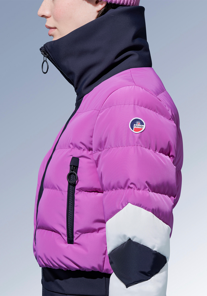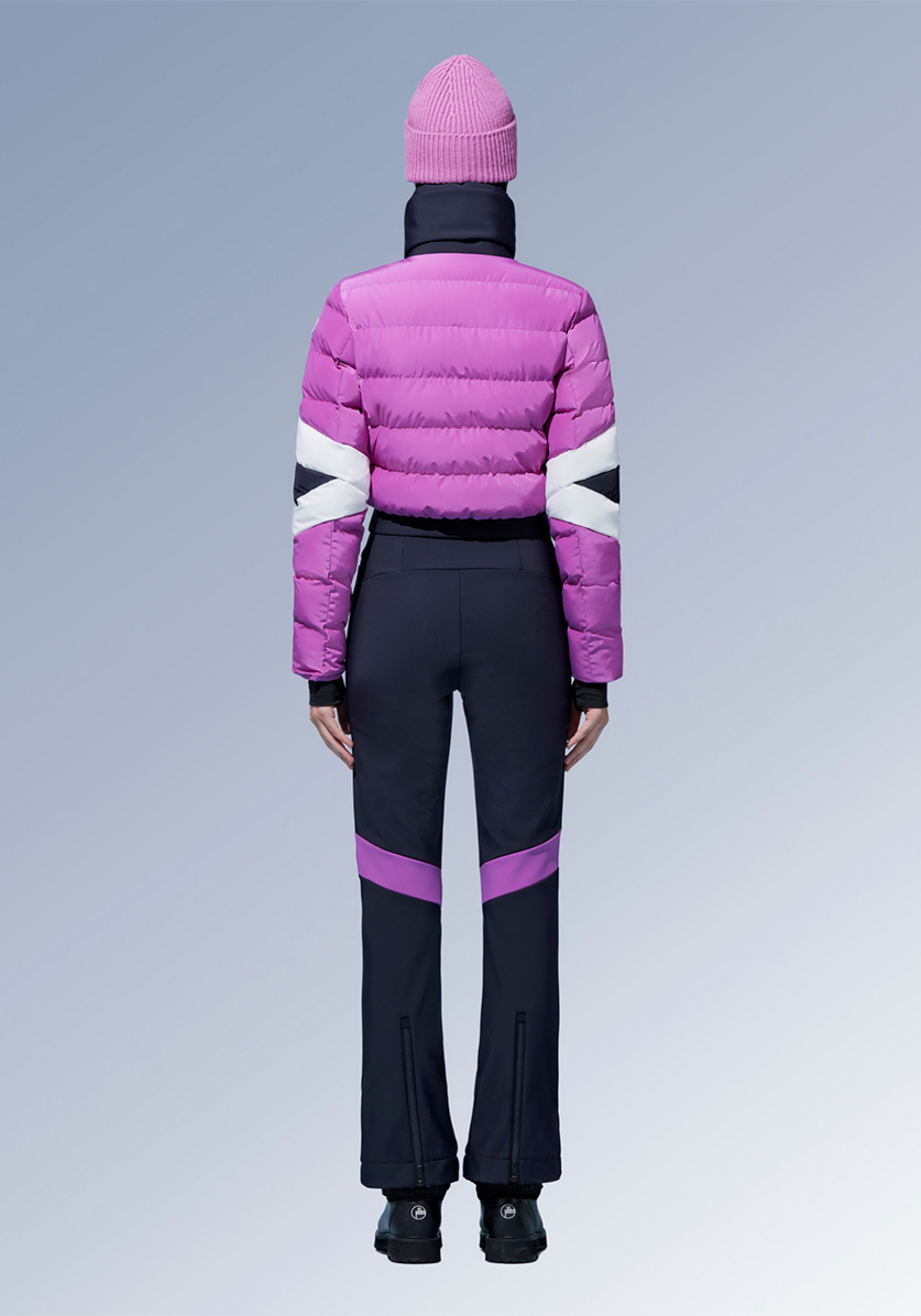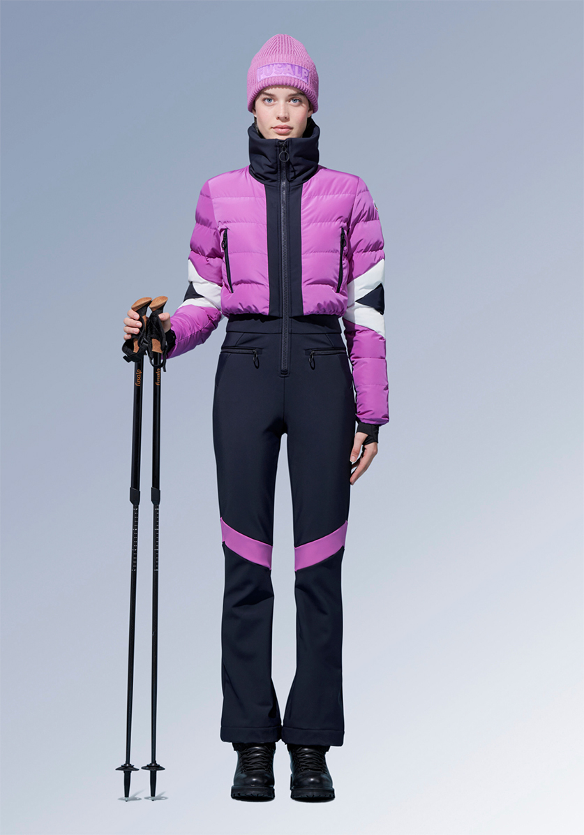 Bonded fleece stretch softshell ski suit with Fusalp approved membrane brings together performance and elegance. DuPont Sorona® fiber insulation provides much warmth at the upper body. A fashion-tech must-have piece for the thrill seeker fashionista.