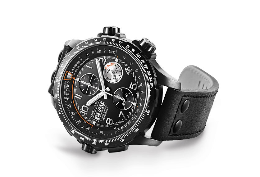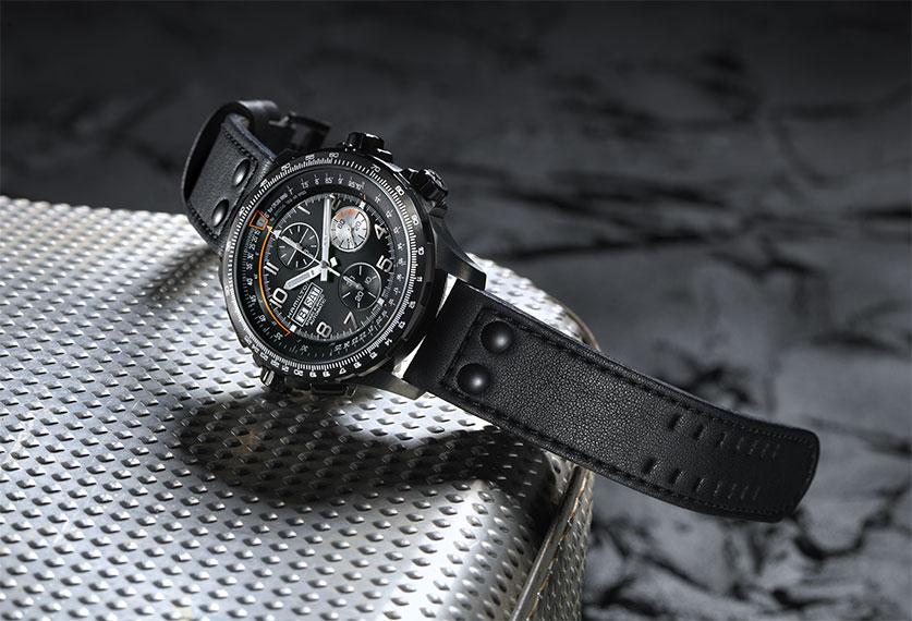 Even with their heads in the clouds, the heroes of the sky retain an innate sense of elegance. Proof of that comes with this classy watch, with its 45mm black PVD coated stainless steel case and its orange 24-hour markers. The steely nature of this timepiece is reflected by three chunky pushers, while the Calibre H-30 self-winding movement provides 80 hours of power reserve.