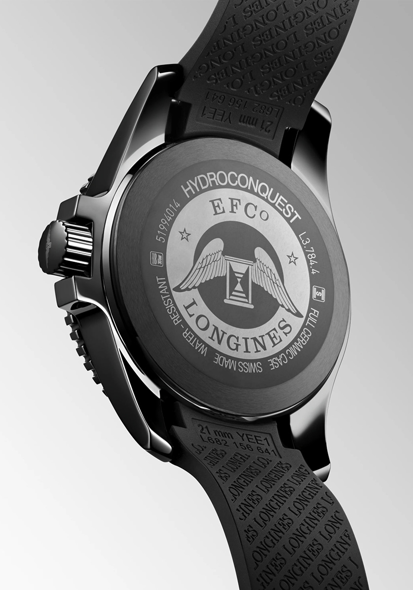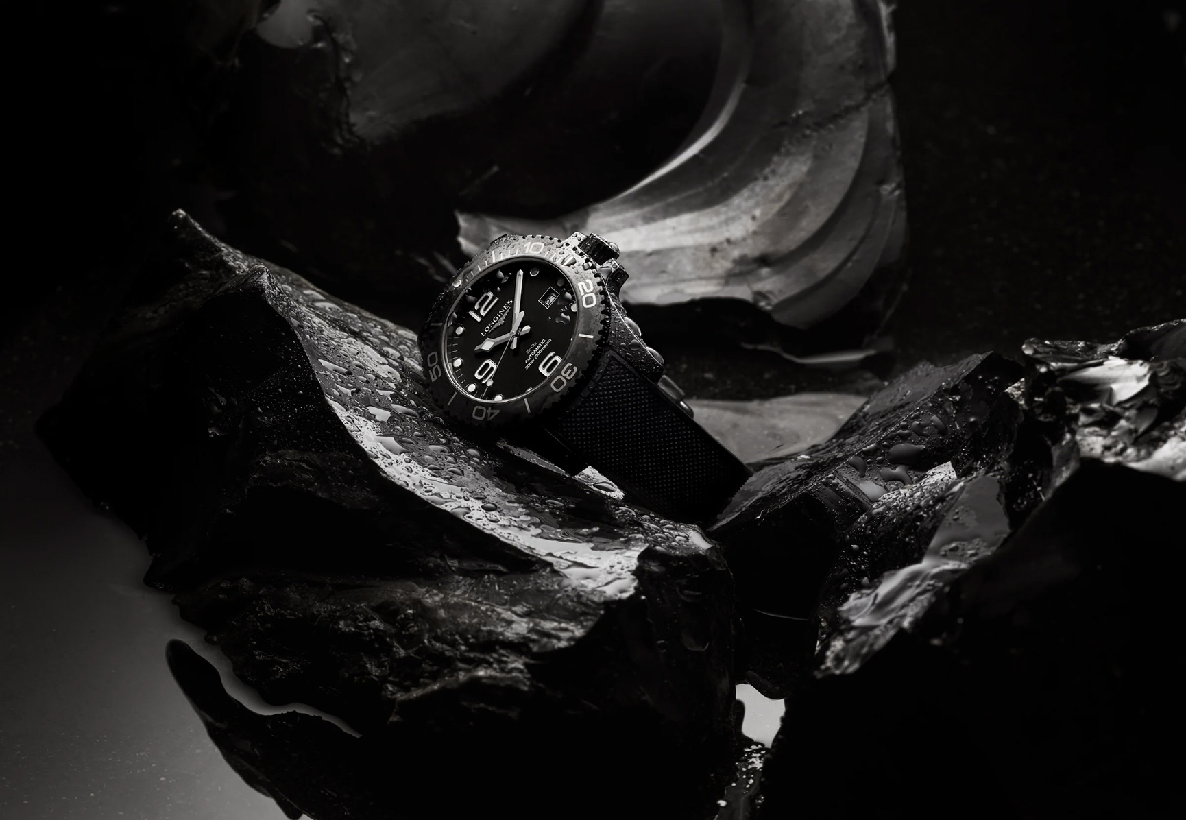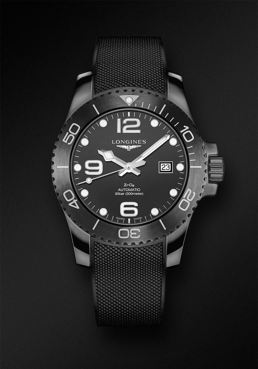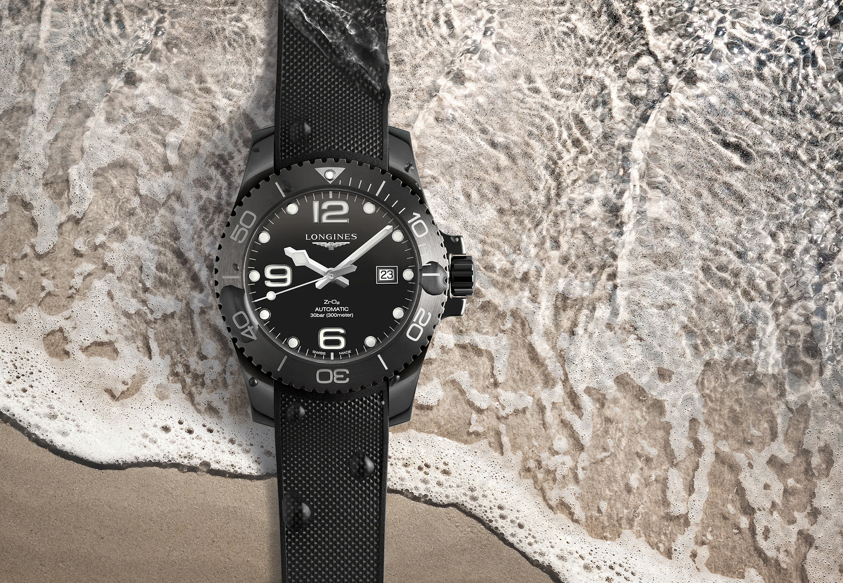 This model from the HydroConquest collection — which came to life in 2007 with watches that are waterproof up to 300 m — reinterprets the traditional dive watch. Boasting an entirely black look, it’s topped with a sporty case and bezel in ceramic, which is both extremely elegant and highly scratch-resistant.