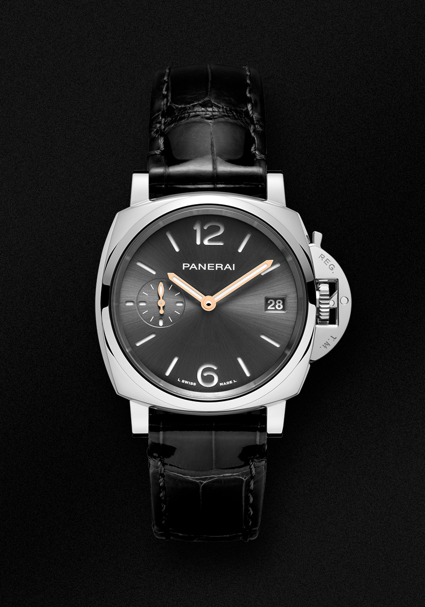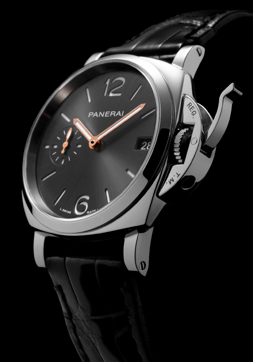 Looking for a modern, chic, and sporty watch, with a hint of classic Italian elegance? Here it is, in glorious perfection! This version of the Luminor Due 38 mm features seductive, racy curves, a sunray anthracite dial, and hands in rose gold and Super-Luminova, which subtly enhance the watch’s overall look.