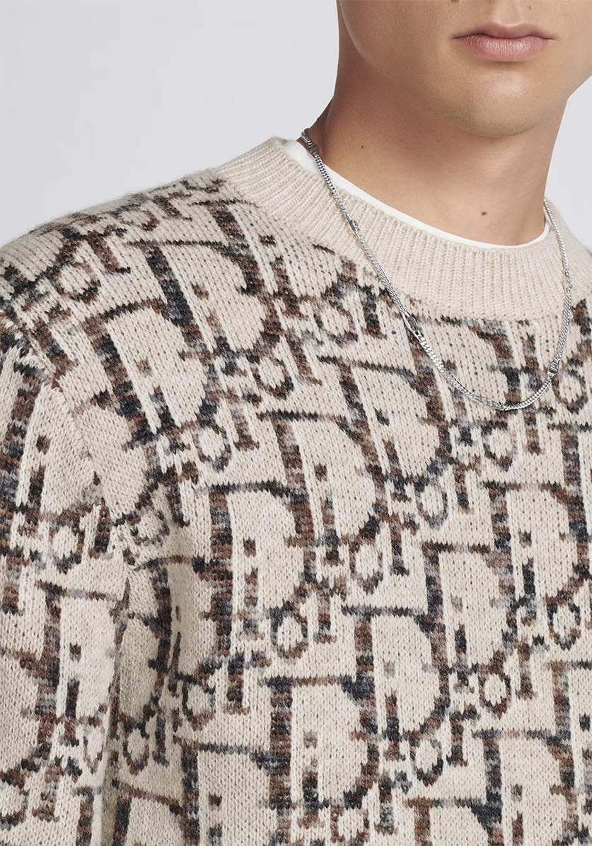 The knit sweater reimagines the House's hallmark Dior Oblique motif. Crafted in beige and brown wool jacquard, the design has a classic silhouette completed by a ribbed round neck, hem and cuffs. The elegant style will lend a graphic touch to any outfit.