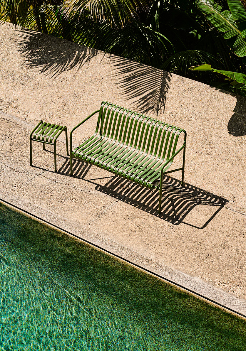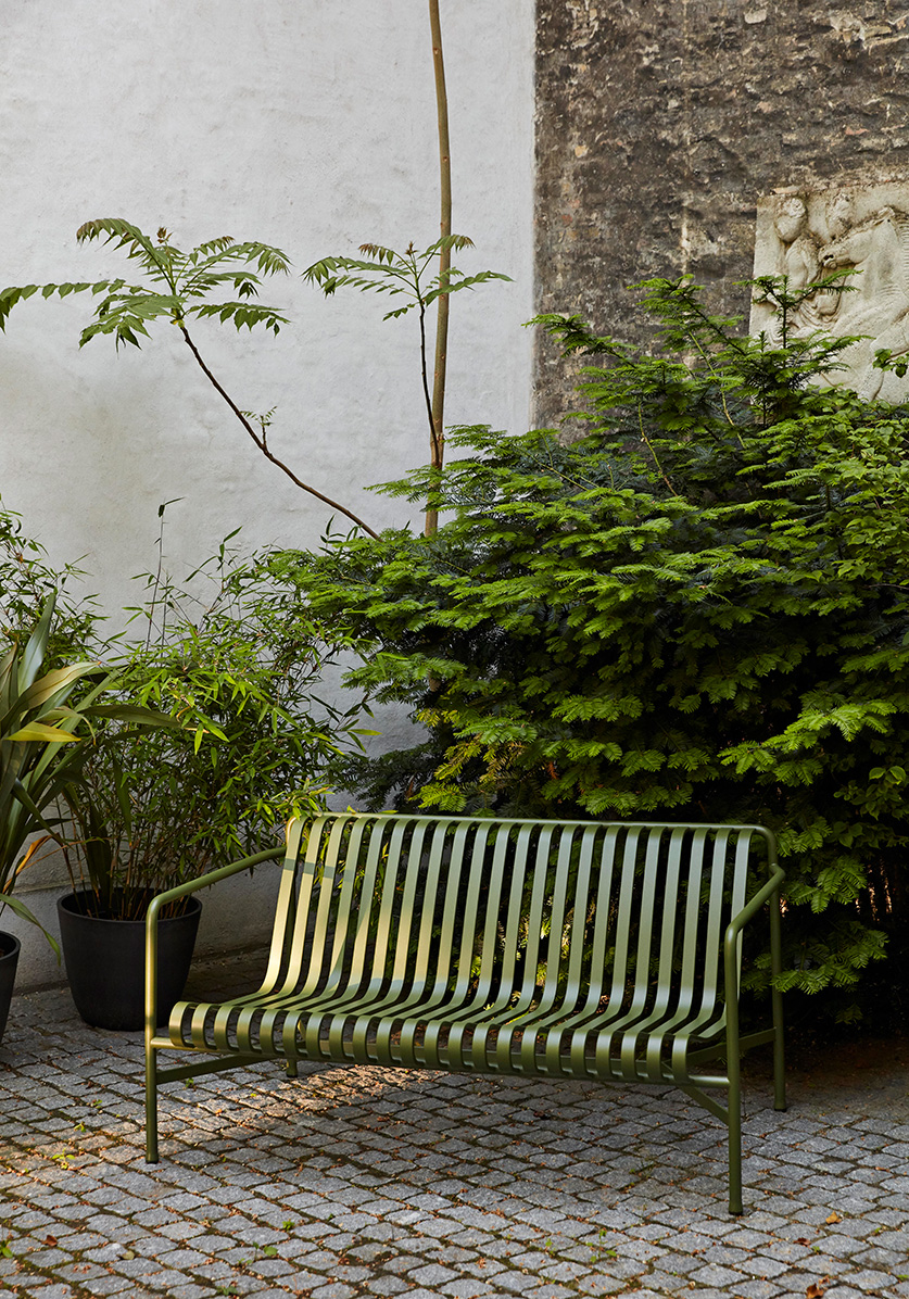 Shown here in olive green, this calm, earthy tone is meant to harmonise with natural landscapes and urban materials alike. The bench is also available in a range of subtle or statement hues, all curated to suit a wide array of outdoor settings.