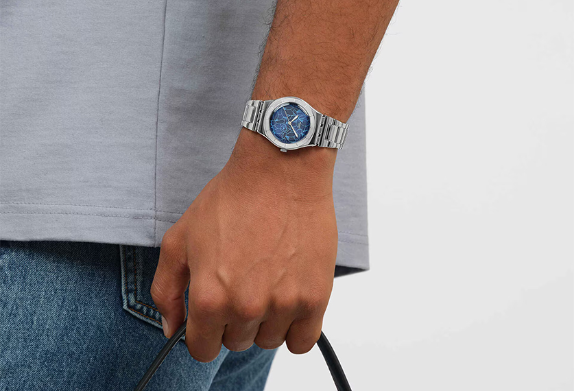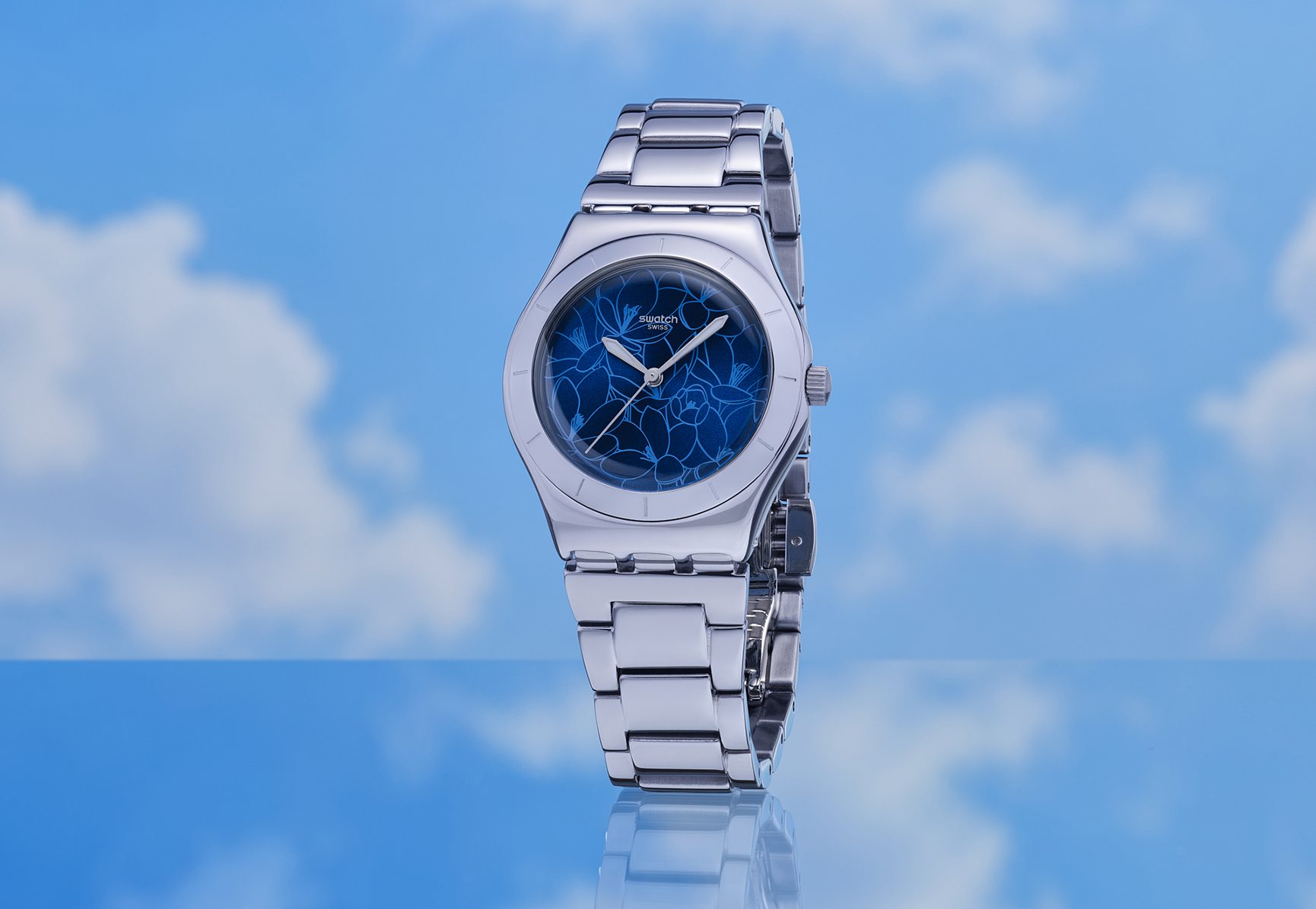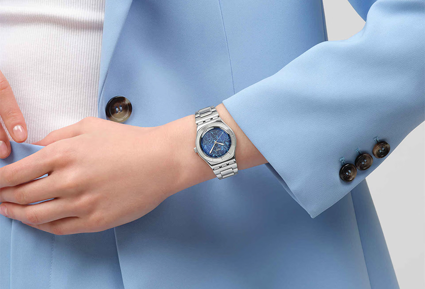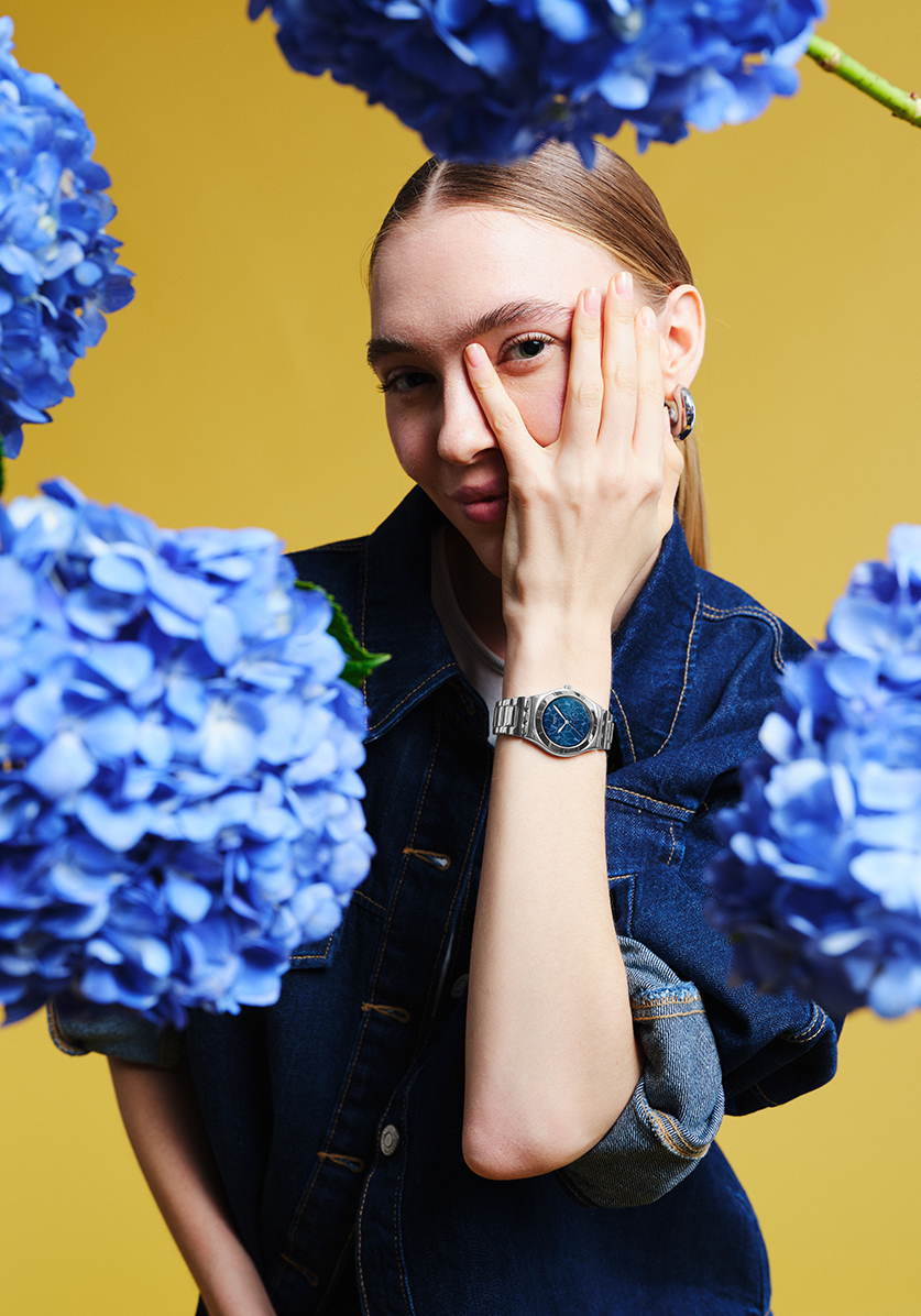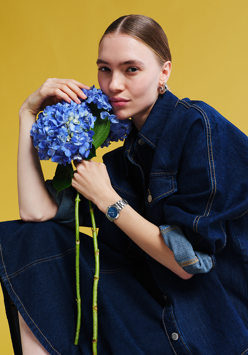 Part of the Blossom Time collection, this watch features a blue sun-brushed dial with a printed light blue pattern of beautiful, spring flowers. The 33 m case and bracelet are made of polished stainless steel, but a cerulean leather strap with blue stitching is also available as a variant. The silver-coloured hour and minute hands glow in the dark, giving this creation a playful and attractive touch.