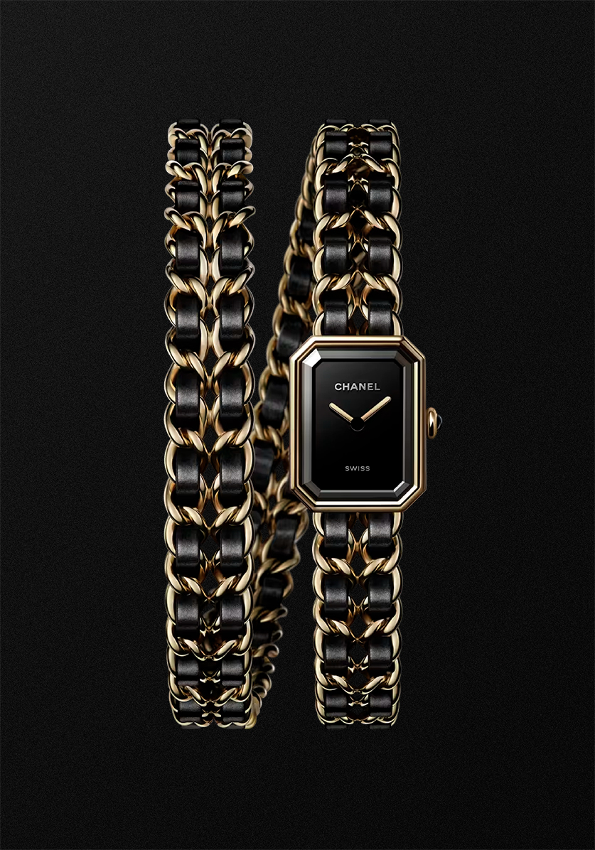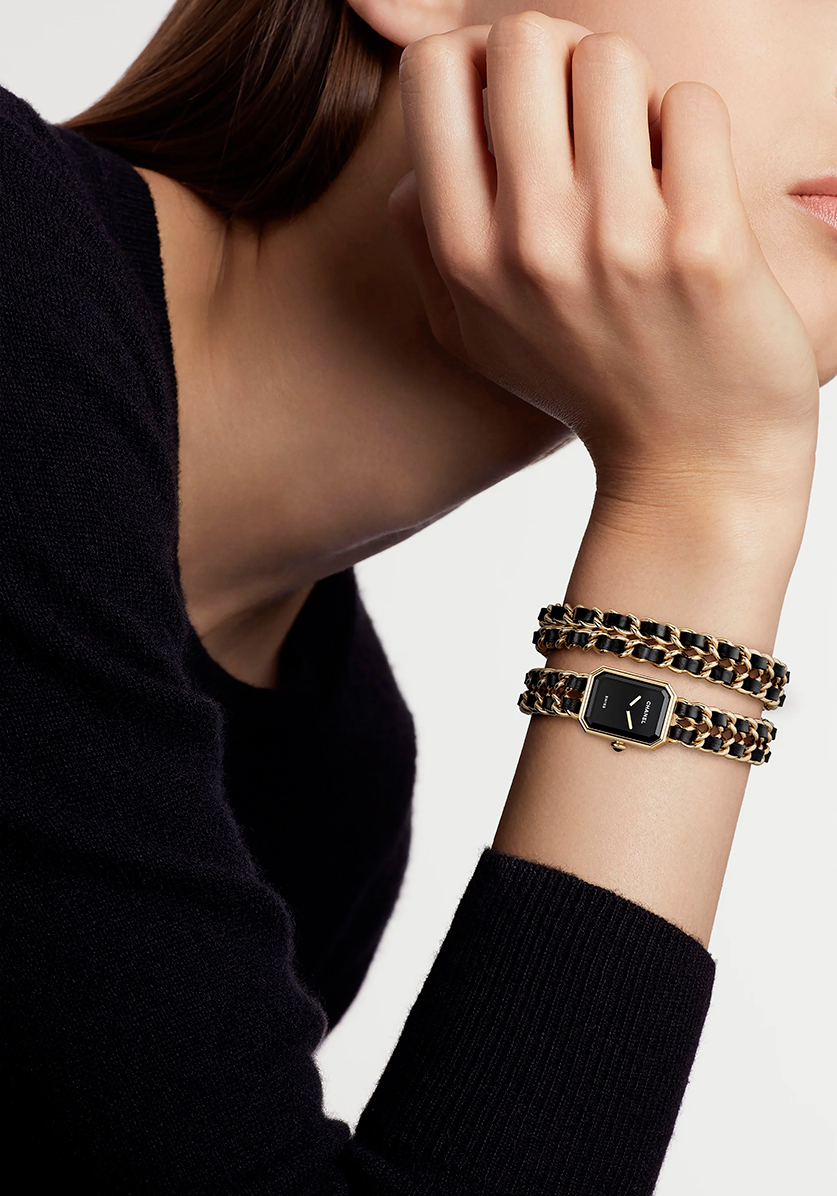 Sensual and chic, this watch reveals an octagonal (19.7 x 15.2 x 7.5 mm) steel case coated with 18K yellow gold — or steel, depending on the chosen variant — and a high-precision quartz movement. The deep, black-lacquered dial echoes the elegant chain bracelet that’s interwoven with black leather strap, which wraps twice around the wrist. The cherry on the cake is the crown adorned with an onyx cabochon.