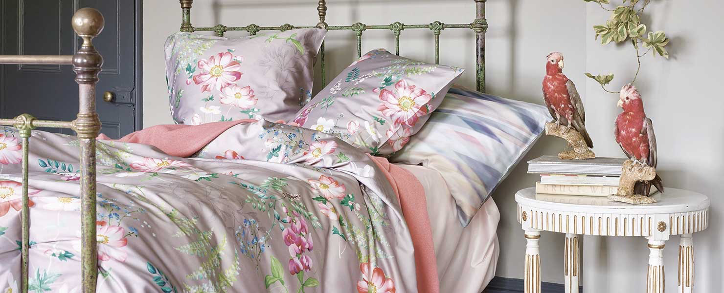De délicates fleurs printanières courent sur un peignoir neigeux. Des plumes d’oiseaux exotiques volettent sur une couette en satin. Des agapanthes et des boutons d’or foisonnent en pleine verdure, de jolies gueules-de-loup, des bougainvillées, des roses et des marguerites prospèrent sur les tissus signés Schlossberg. D’autres arborent des lianes entrelacées aux subtils estompages, ton-sur-ton, des feuilles de ginkgo automnales, des motifs géométriques, des mosaïques, des carreaux à la tweed, des volutes en mouvement…