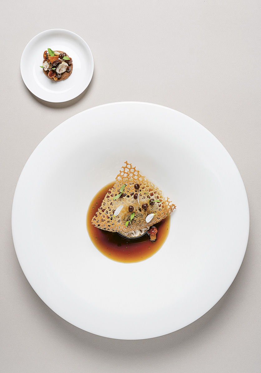 La salle est élégamment épurée, la terrasse panoramique et la cuisine fantastique. « Découverte de l’année 2025 » de Gault&Millau, le chef André Kneubühler a fait gagner deux points à la maison (17 points) depuis son arrivée il y a à peine deux ans ! « Aux âmes bien nées, la valeur n’attend point le nombre des années », dit l’expression, taillée par Corneille. Elle va comme un gant à ce jeune chef de 31 ans formé à l’école de la grande Tanja Grandits, maîtresse d’orchestre du Stucki de Bâle. On retrouve à l’Omnia la même religion des produits d’exception, de saison, les mêmes impeccables présentations, déclinées sur fond de menus d’essence végétarienne, que peuvent néanmoins enrichir poissons et viandes.
