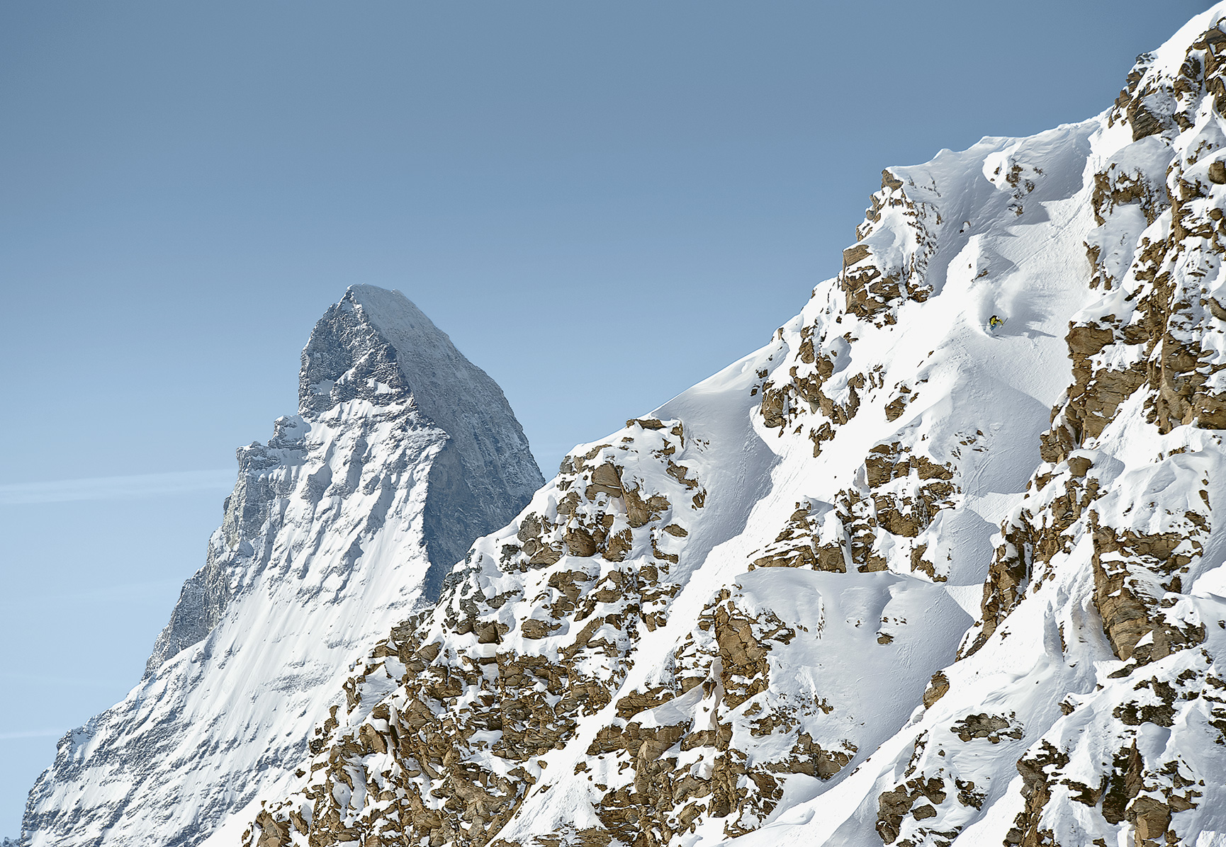 Il y a enfin les runs qui construisent la légende, à commencer par celui qui relie le Petit Matterhorn au cœur de Zermatt (jusqu’à 25 km de ski non-stop pour 2’263 m de dénivelé !). En chemin : un panorama époustouflant sur le Cervin. À l’opposé, le run dévalant jusqu’à Valtournenche par la Reine Blanche s’étire sur 20 km. Pour les plus émérites, la Nera del Cervino (n°59), alias The Wall, au pied de la face sud de la montagne, tutoie les 65 %. Un peu plus de recul, peut-être ? Les pistes 11 et 7 Rothorn-Sunnegga, la 15 (Tufternkumme) et les 52 et 54 (Hirli) veillent à distance l’iconique pyramide. Autre temps fort, accessible au plus grand nombre : une descente « First Track » entre le Trockener Steg et Furi, proposée tout au long de la saison, chaque lundi et jeudi à 7 h 40, avant l’ouverture du domaine au public. La sensation garantie d’avoir les montagnes rien que pour soi.