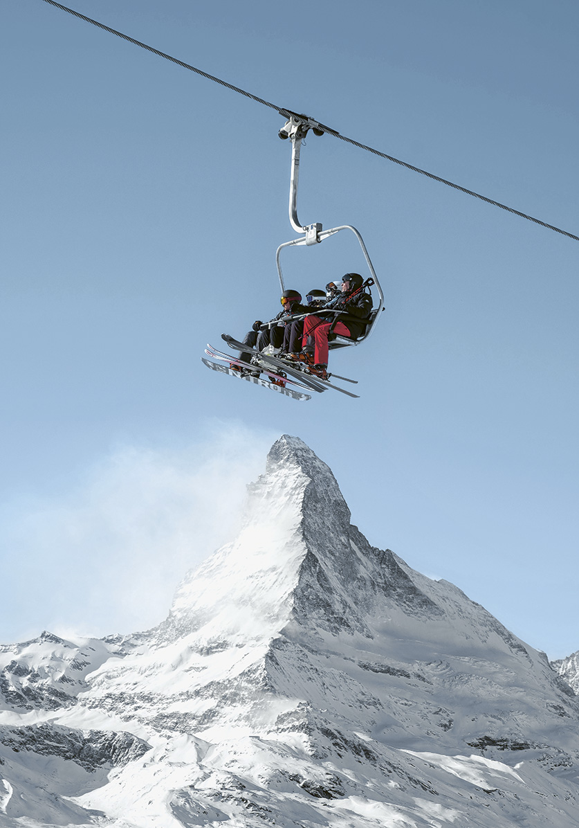 horn (3’883 m), d’une stabilité à toute épreuve bien qu’elle repose seulement sur trois piliers, et son prolongement transfrontalier, la X-Alps, inaugurée en 2023, qui permet de passer à pied sec du village de Zermatt à celui de Breuil-Cervinia sans même marcher dans la neige ! Cela dit, si la technologie est reine, la tradition n’est pas oubliée et le forfait comprend aussi la montée au Gornergrat (3’089 m) par le petit train rouge à crémaillère inauguré en 1898 ! Trente-trois minutes de bonheur avec, dans le viseur, le Cervin non-stop, puis le long fleuve gelé du Gornergletscher, le second plus long glacier du pays (12 km). So Swiss.