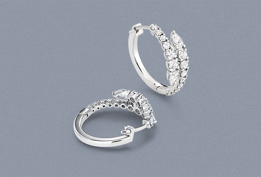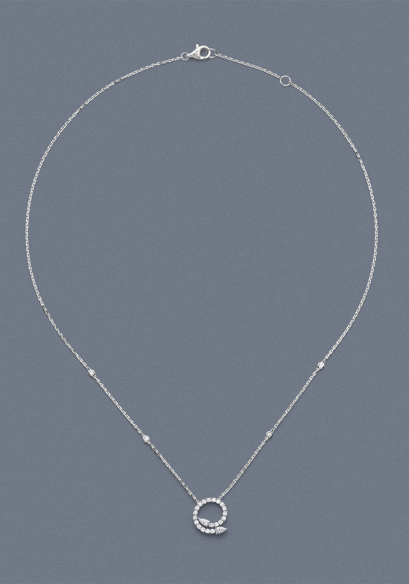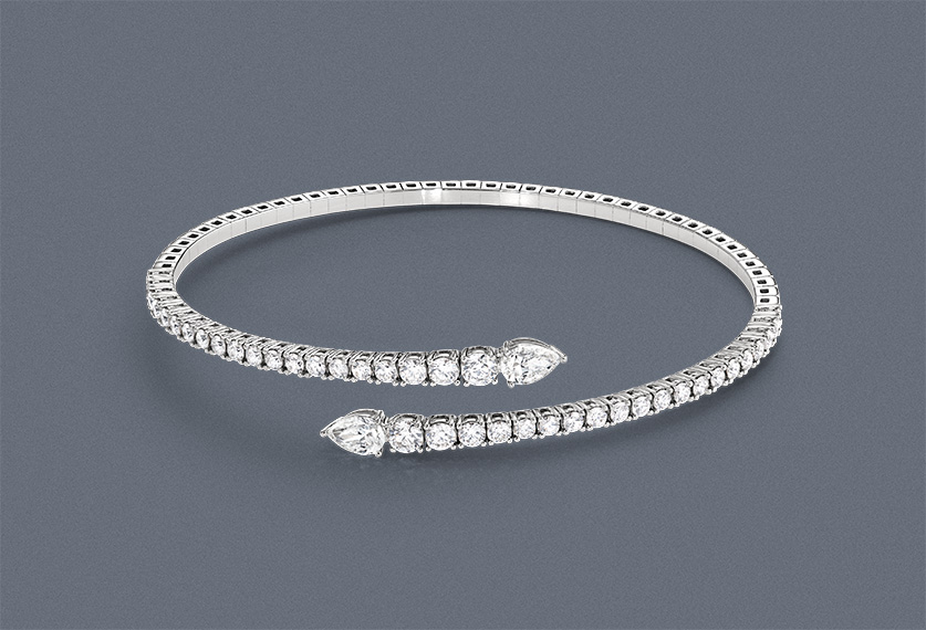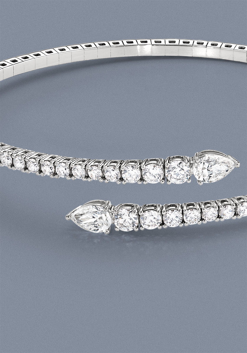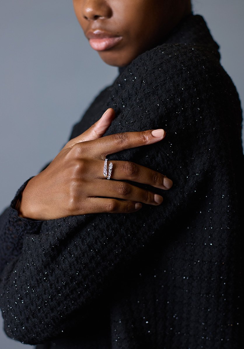 Façonnée en or blanc et en or rose 18 carats, la ligne Diamond Twist se décline en bagues, boucles d'oreilles, bracelets rigides et colliers. Sa signature réside dans une silhouette délicatement torsadée et fluide: une ligne de pierres précieuses serties avec précision épouse la courbe de la forme dans un mouvement harmonieux, soulignant son dynamisme naturel. Des diamants taille goutte et taille brillant, parfois rehaussés par la pureté graphique de la taille émeraude, confèrent aux créations profondeur et caractère. L'interaction de ces différentes tailles donne naissance à un subtil jeu de lumière, oscillant entre éclats scintillants et présence sereine. La fluidité des lignes et le placement minutieusement étudié des diamants créent une délicate illusion de mouvement, à la fois vivante, légère et parfaitement maîtrisée. L'éclat ne se fait jamais ostentatoire: il se révèle avec une évidence naturelle dans le jeu de la lumière.