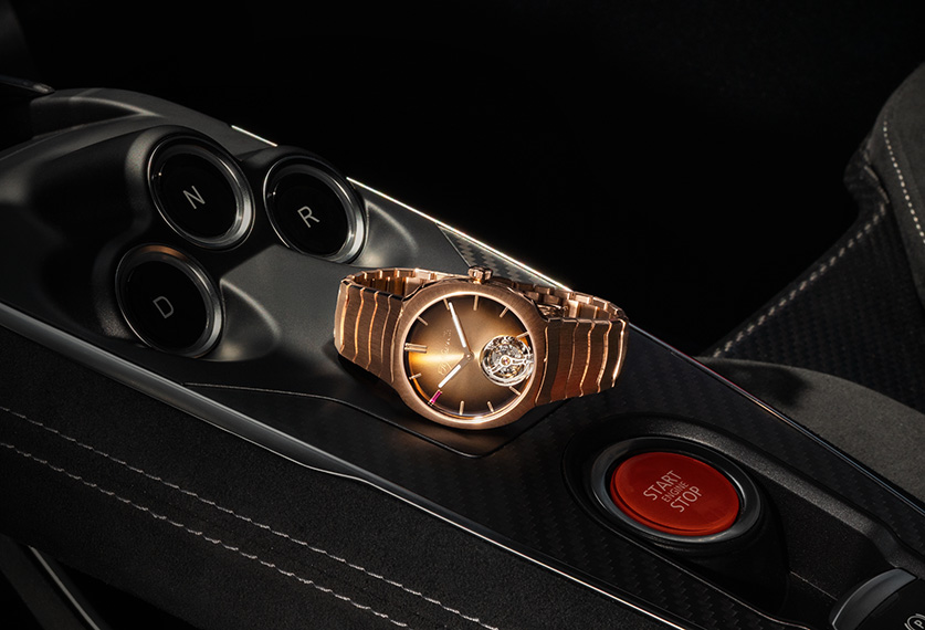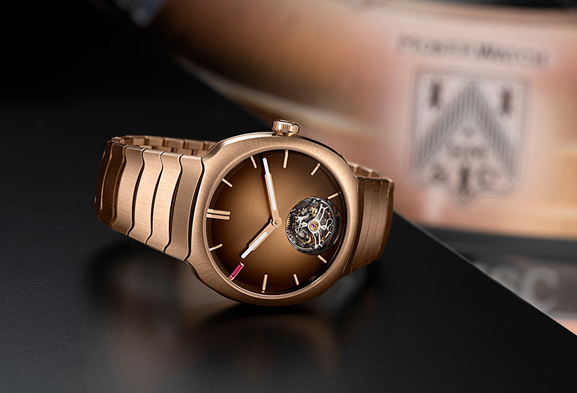 Le cadran, d’ailleurs, il l’a voulu à son image. Profond, subtil, légèrement mystérieux. Il l’a baptisé lui-même : Chocolate fumé. Une teinte intense, d’un brun riche et nuancé, qui évoque à la fois la puissance contenue, le goût du détail et ce raffinement sans ostentation qu’on devine chez lui, derrière les lunettes de soleil et les combinaisons de course. Ce brun fumé, typiquement Moser dans son traitement, arbore le logo de la marque en laque transparente et devient ici un terrain d’expression inédit, presque gourmand. Il contraste volontairement avec l’architecture racée du boîtier Streamliner en or rouge 5N. Cette tension entre rondeur chromatique et ligne sportive dessine un équilibre singulier, celui-là même que cultive Pierre : la précision du pilote, alliée à une présence chaleureuse.