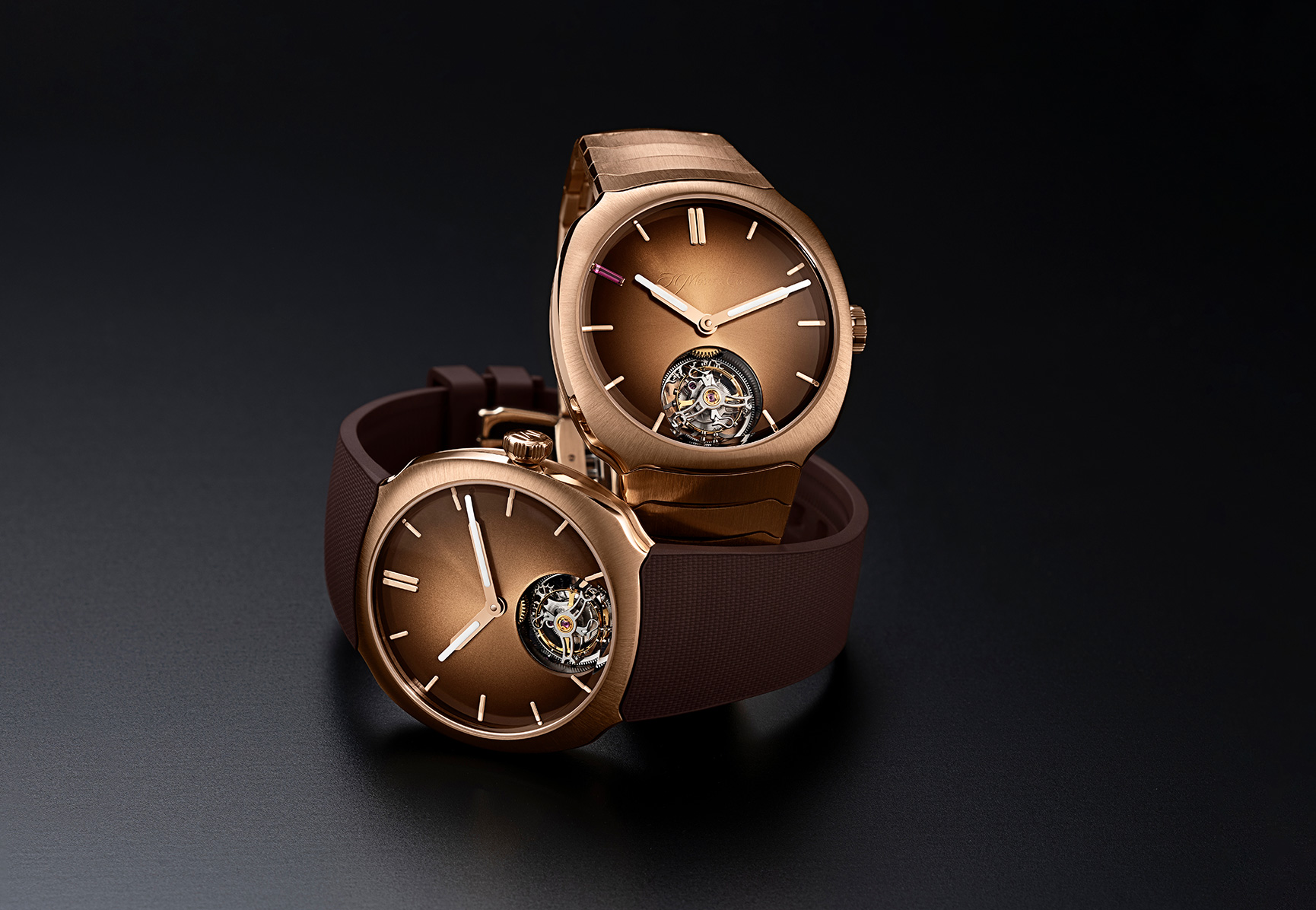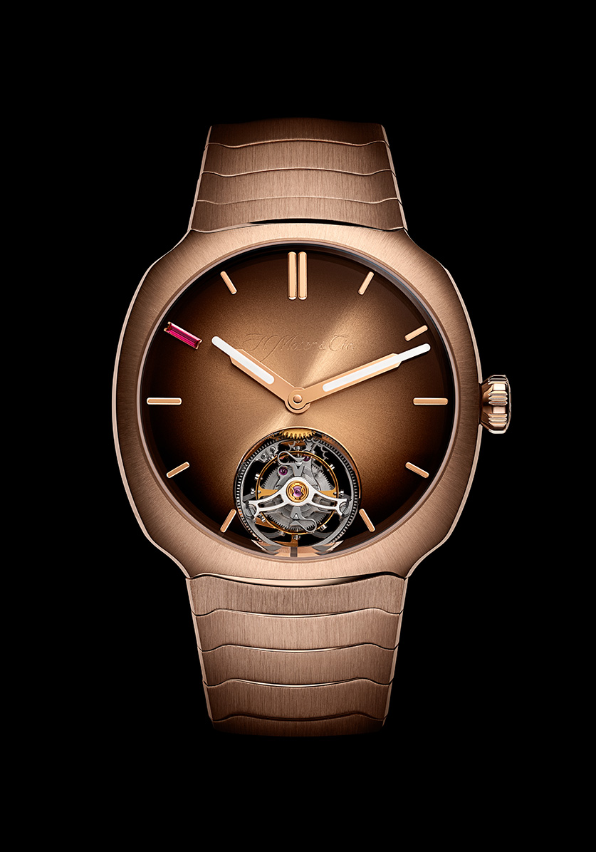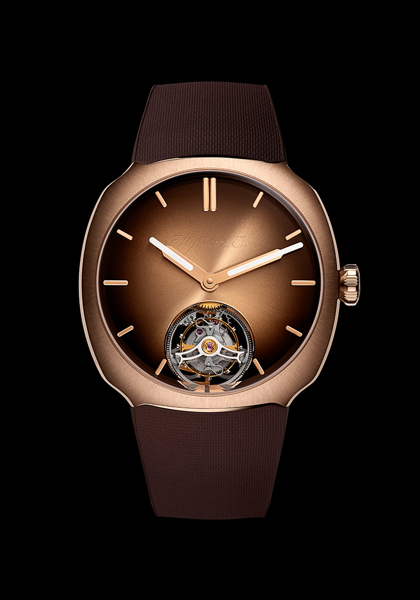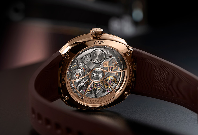 Au coeur de la montre, un tourbillon volant une minute donne le tempo. Positionné à six heures, il offre un spectacle presque méditatif. Merveille d’ingéniosité, le calibre HMC 805 à remontage automatique qui anime cette pièce est muni d’un double spiral conçu et produit en interne par la société soeur de H. Moser & Cie., Precision Engineering AG. Cette paire de spiraux concordants compense les déplacements du point de gravité que chaque ressort subit lors de son expansion, garantissant une précision et un isochronisme accrus, dans une quête perpétuelle de perfection.