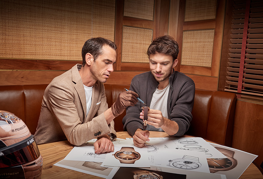 De la rencontre entre Pierre Gasly et H. Moser & Cie. est née une montre à son image, presque une extension de sa personnalité, façonnée au millimètre par Pierre lui-même, en collaboration étroite avec les horlogers de la manufacture. Il n’a pas seulement prêté son nom à ce garde-temps : il a pensé l’objet, choisi les textures, exigé le tourbillon. « J’ai toujours été fasciné par ce mécanisme. Il y a quelque chose de presque hypnotique dans ce ballet constant. C’est aussi un parallèle avec le monde de la F1, par sa précision et son excellence technique », explique-t-il. Pierre s’est impliqué dans chaque étape de la création du Streamliner Tourbillon Pierre Gasly, du choix du mouvement à la nuance du cadran. Edouard Meylan, CEO de H. Moser & Cie., sourit : « Dès notre première rencontre, Pierre avait une idée très précise de ce qu’il voulait. Nous lui avons proposé des dizaines d’alternatives pour le challenger, le pousser hors des sentiers battus. Mais à chaque fois, fidèle à son instinct, il revenait à cette pièce. La sienne, telle que nous la présentons ».