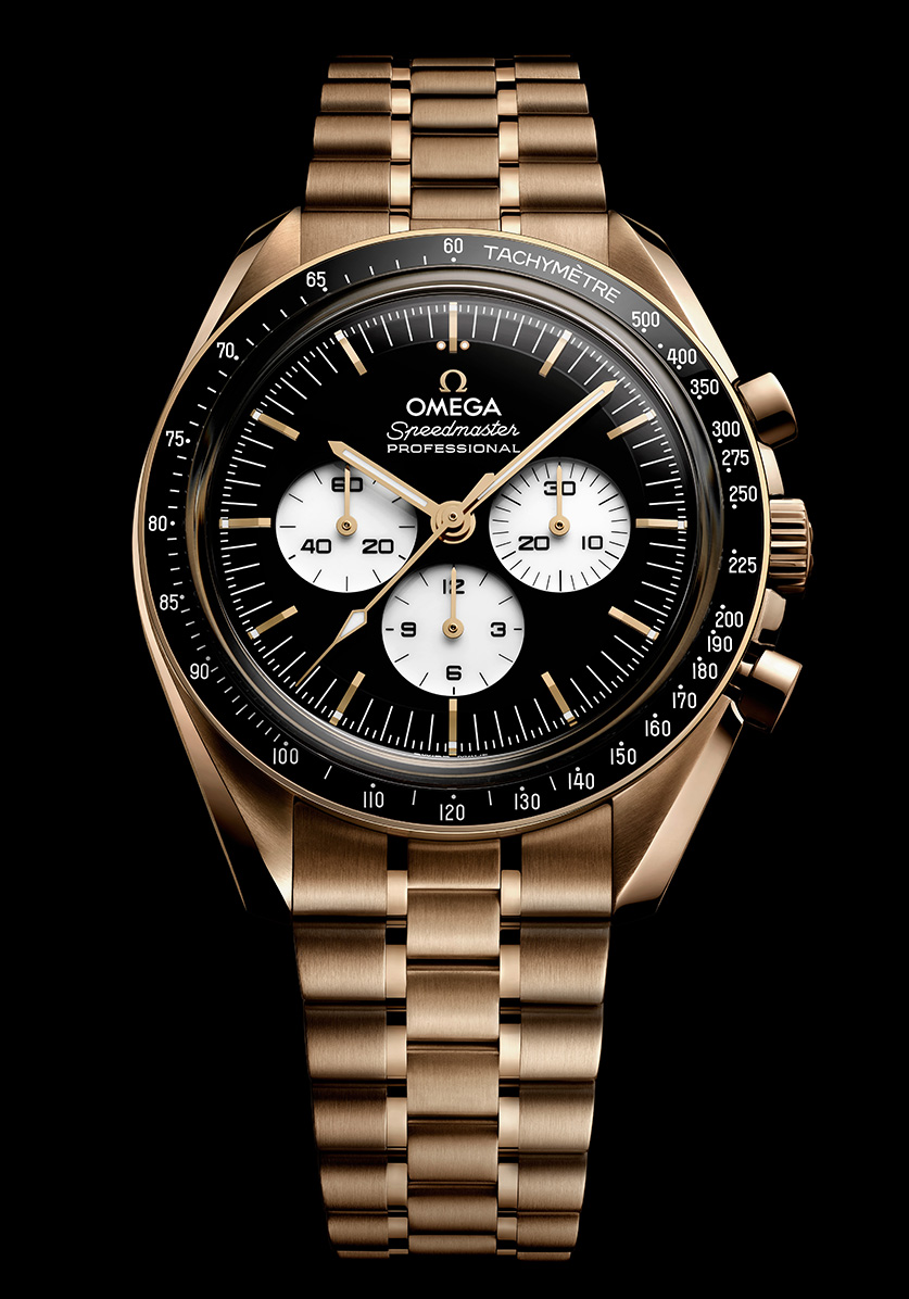 • Une version en or Moonshine™ 18K, l’alliage d’or jaune exclusif d’OMEGA. Les aiguilles des heures et des minutes, celles des compteurs et les index des heures sont en or Moonshine™ 18K et revêtus de Super-LumiNova blanc, tandis que l’aiguille de chronographe centrale est en PVD couleur or Moonshine™.