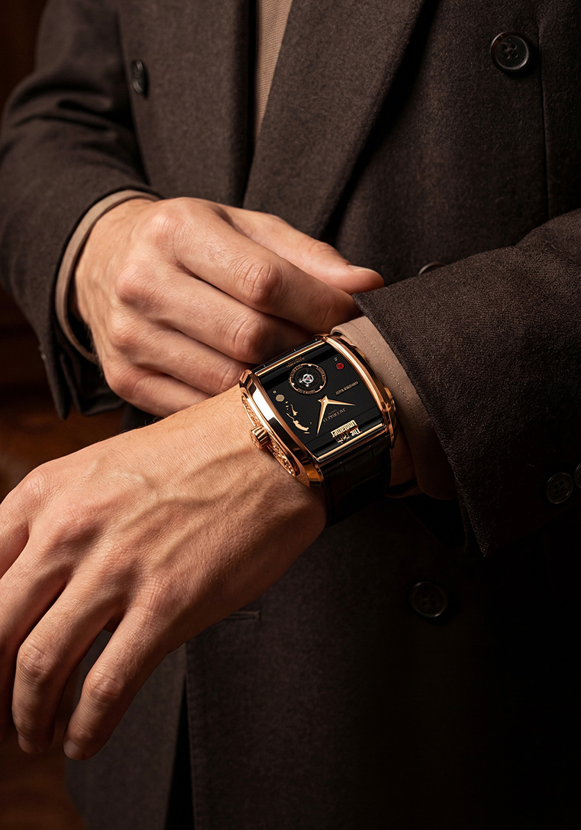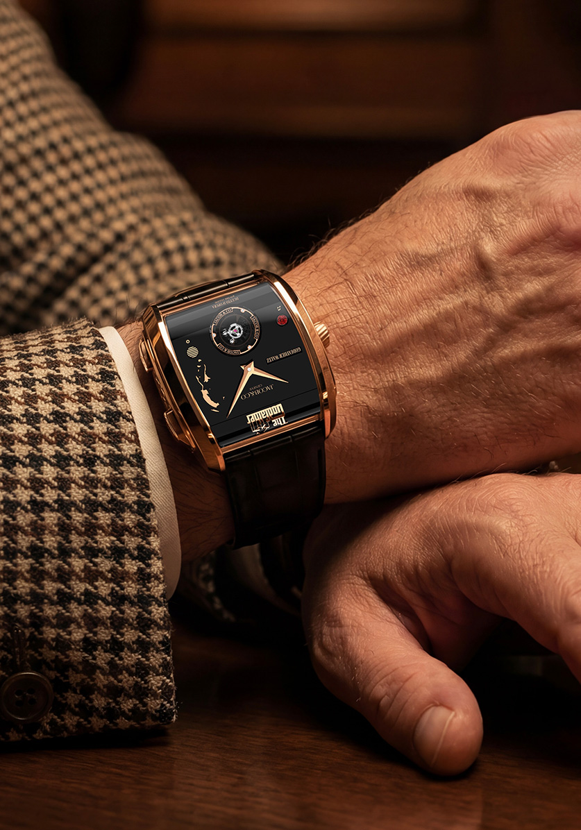 Logée dans un nouveau boîtier rectangulaire galbé d’inspiration Art déco, The Godfather II se distingue par une projection sonore amplifiée portée par une intensité sans égal. Son mouvement, à la construction épurée, intègre un tourbillon volant ainsi que deux indicateurs de réserve de marche, conjuguant complexité musicale et haute horlogerie.