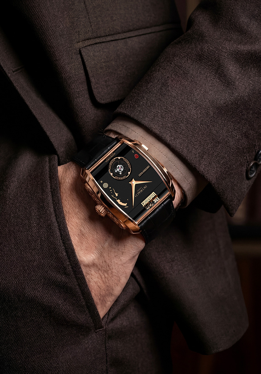 The Godfather II s’inscrit dans la continuité de l’Opera Godfather, garde-temps musical original de 49 mm développé dans le cadre de l’accord de licence avec Paramount Pictures. Ce modèle intégrait un tourbillon triple axe ainsi qu’un mouvement en rotation lors de l’activation de la boîte à musique, posant les fondations de la collection.