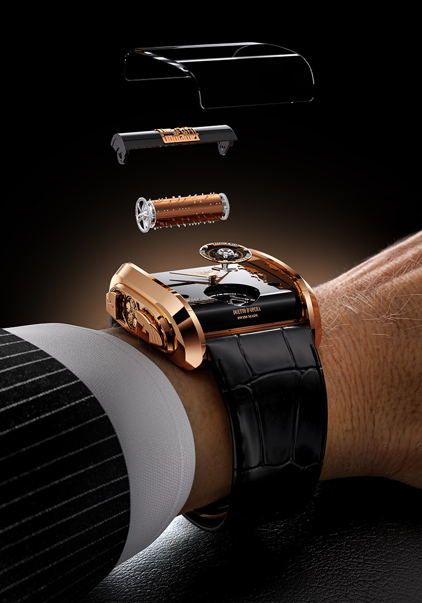 Les deux partitions sont programmées sur un unique barillet de boîte à musique, une avancée technique qui permet de conserver des proportions contenues tout en intégrant un tourbillon volant d’une minute.