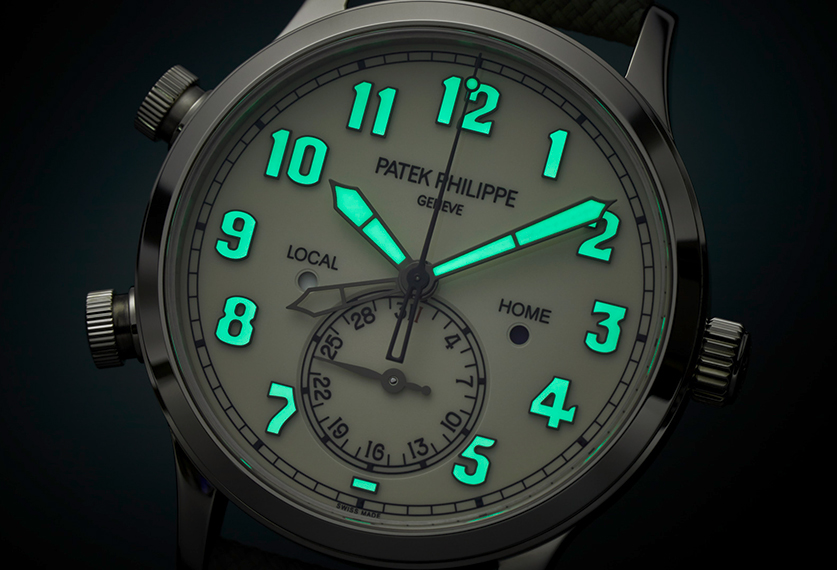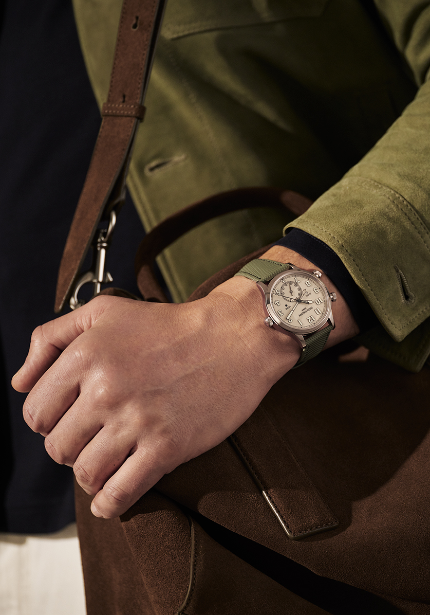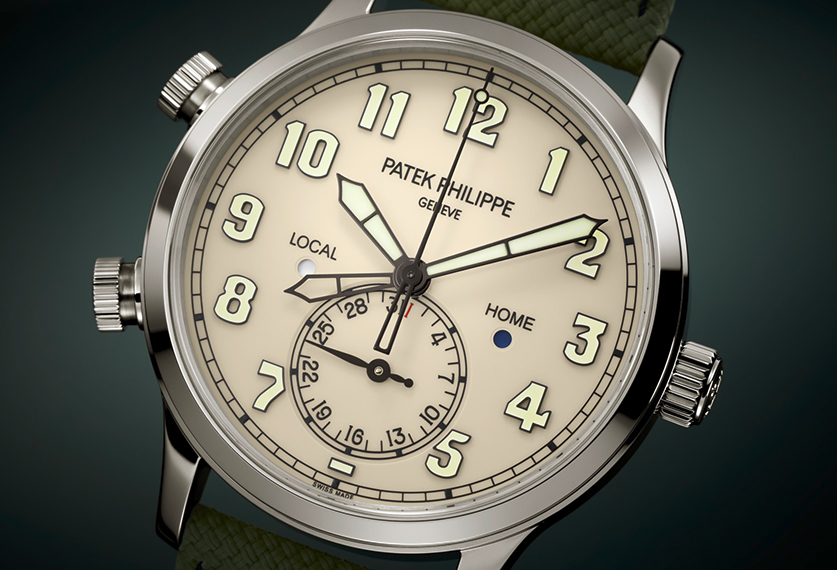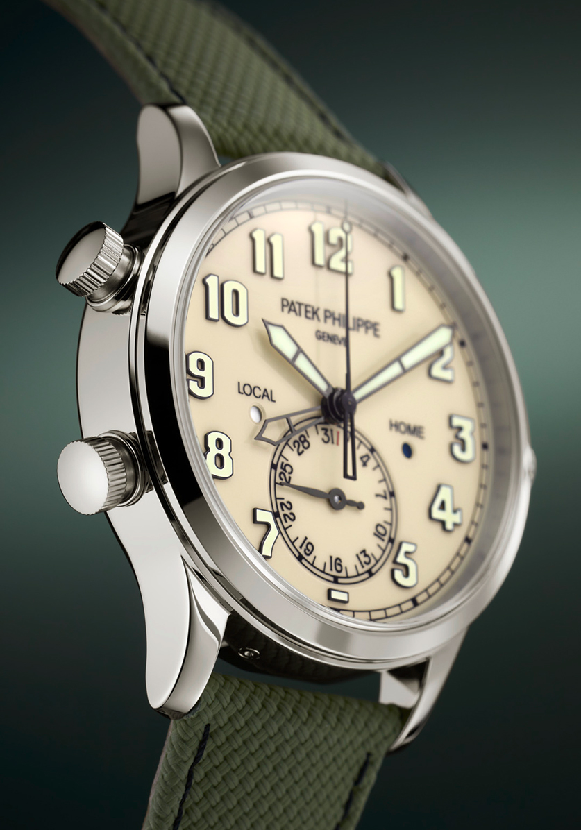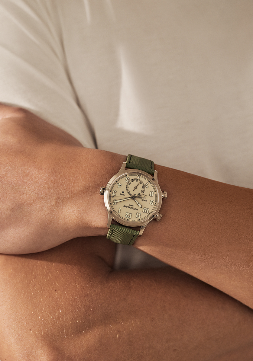 Les montres de pilote ont vu leur popularité rebondir depuis quelques années — les vintage plus encore. Cette pièce signée Patek Philippe en est le meilleur exemple de 2025. Une séductrice assurément, habillée d’un boîtier en or gris enlaçant un cadran laqué ivoire et accompagnée d’un bracelet en matière composite vert kaki au motif tissu. Parmi ses précieuses complications : double fuseau horaire et indication jour/nuit locale.