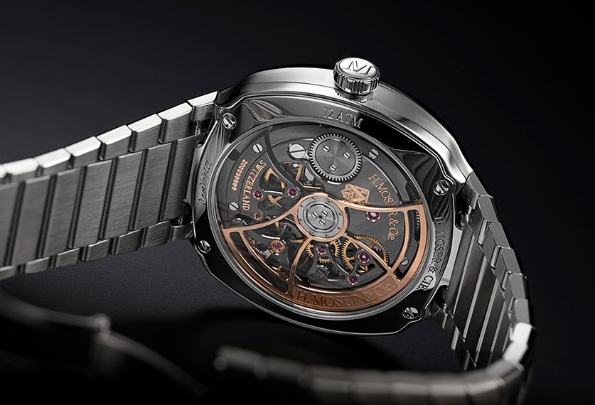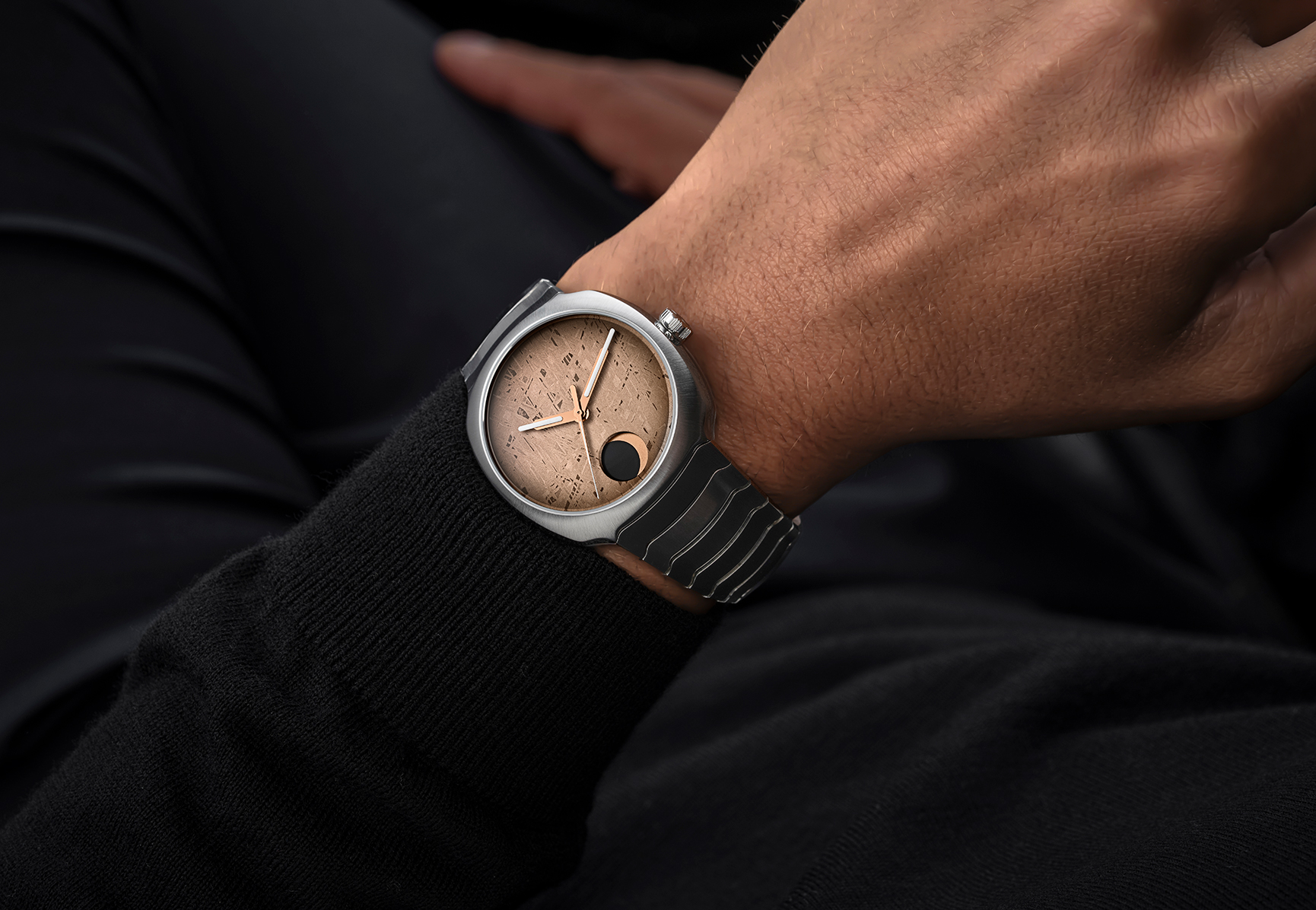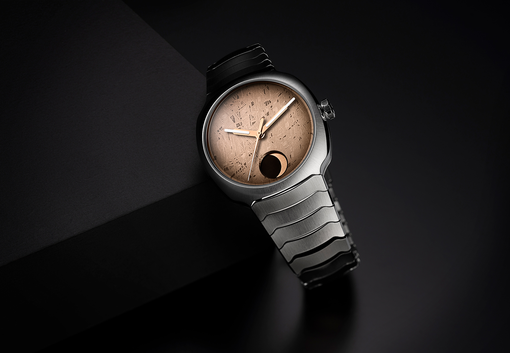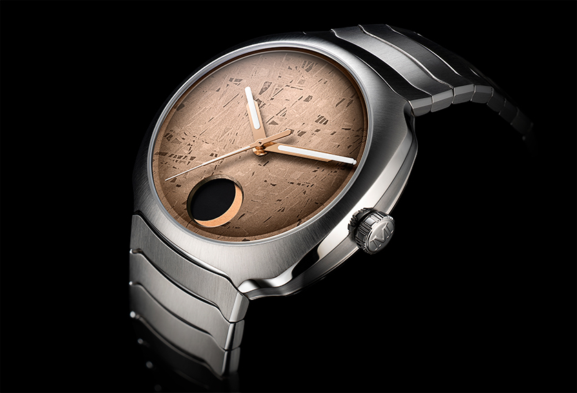 Née de la rencontre entre la terre et le cosmos, cette pièce horlogère est une véritable pépite intergalactique. Un fragment de la météorite de Gibeon, l’une des plus grosses jamais tombée sur Terre, en Namibie, au XIXe siècle, a été intégré sur le cadran de ce garde-temps rehaussé d’une teinte dorée et de l’emblématique effet fumé signature de Moser. La phase de lune, ajustable grâce à un poussoir, sublime la poésie de cette pièce.